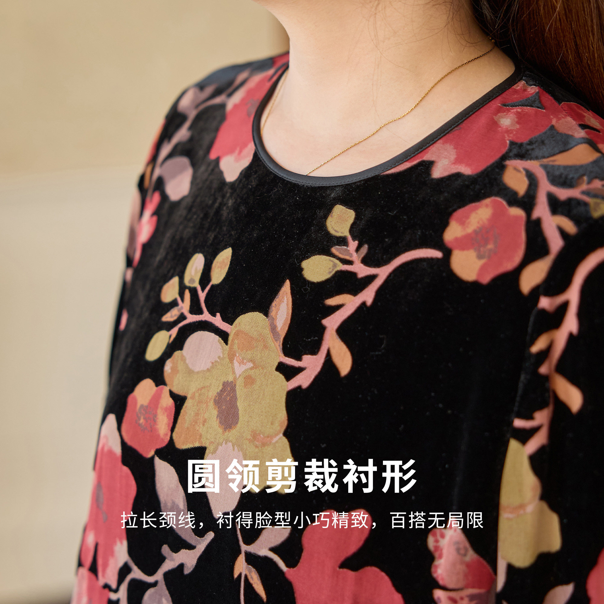 美丽客栈大码黑底印花100%桑蚕丝打底衫上衣女冬新款精致胖mm女装