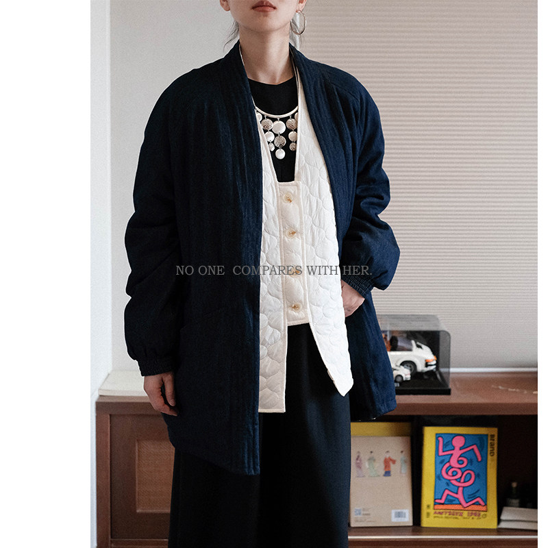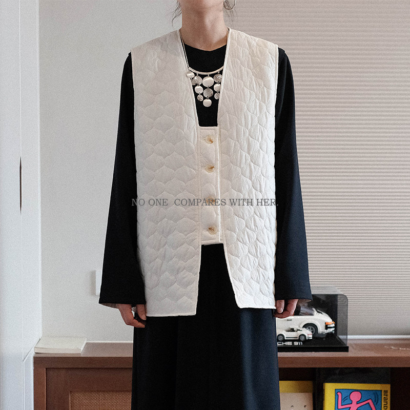 与她原创小众设计 宽松纯色V领轻薄绗缝丝棉通勤中长款西装马甲女