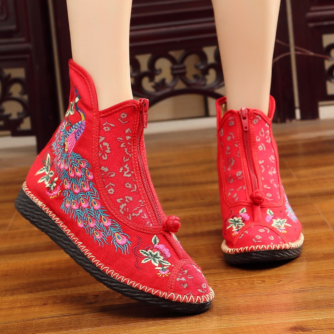 孔雀 春秋冬季新品女士半靴 民族风低筒短靴复古绣花鞋防滑