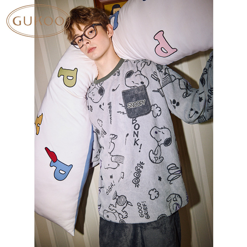 Gukoo/果壳睡衣男冬款加绒史努比联名卡通满印居家套装