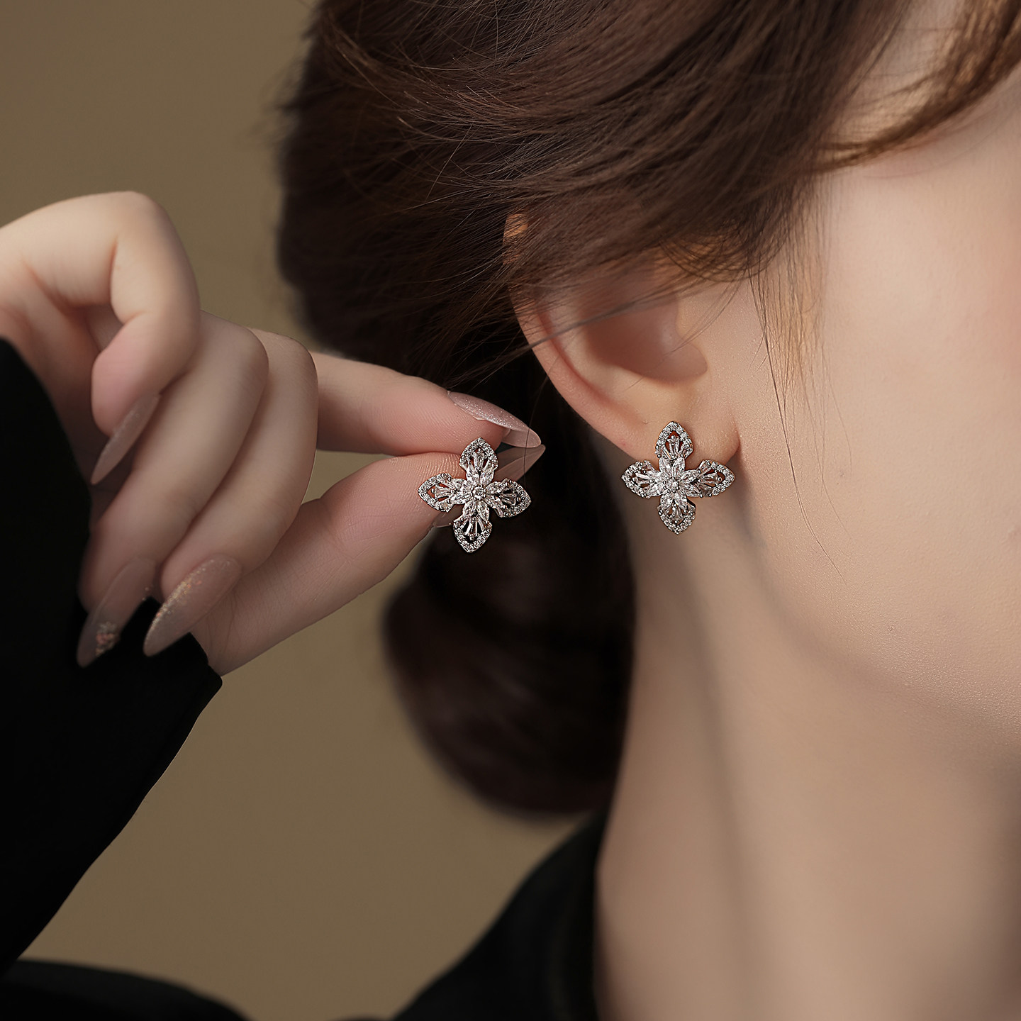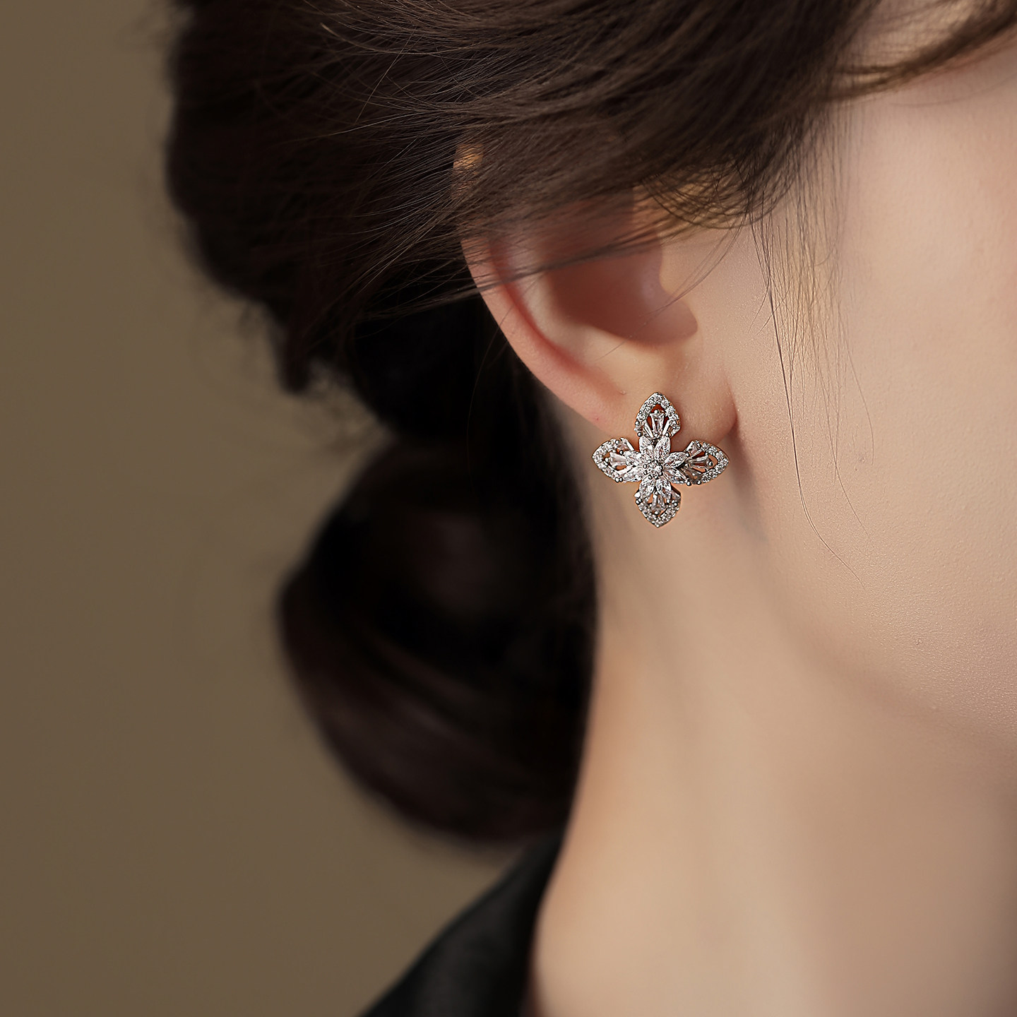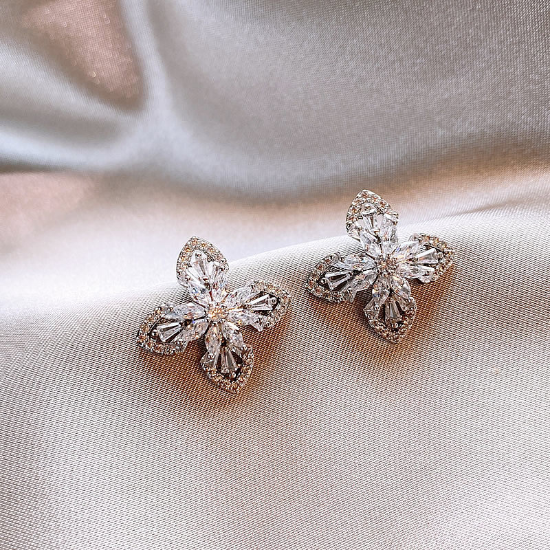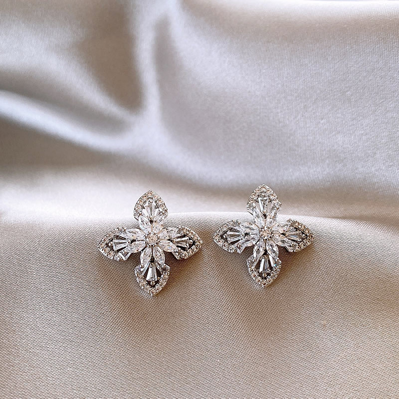 银色满钻四叶草耳钉精致小巧耳饰