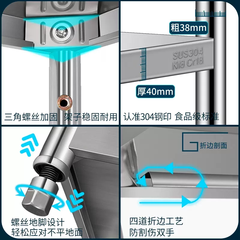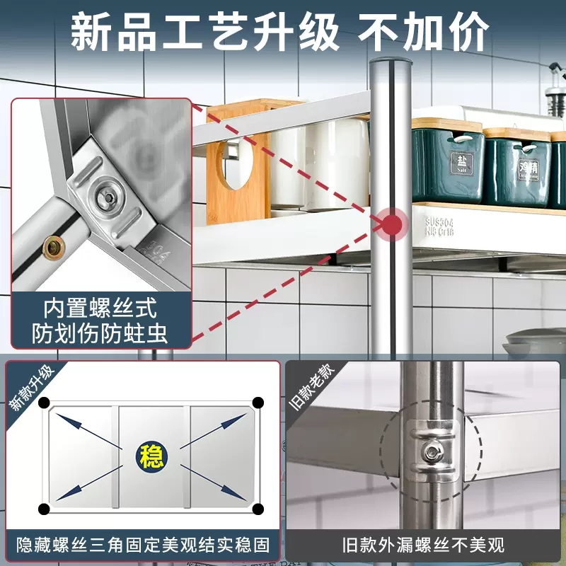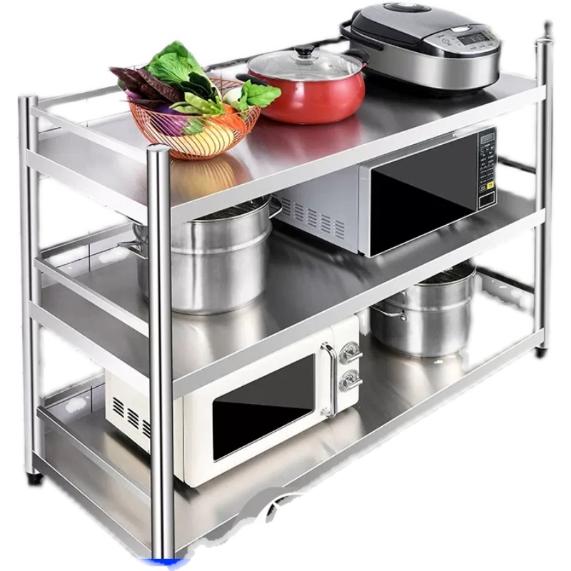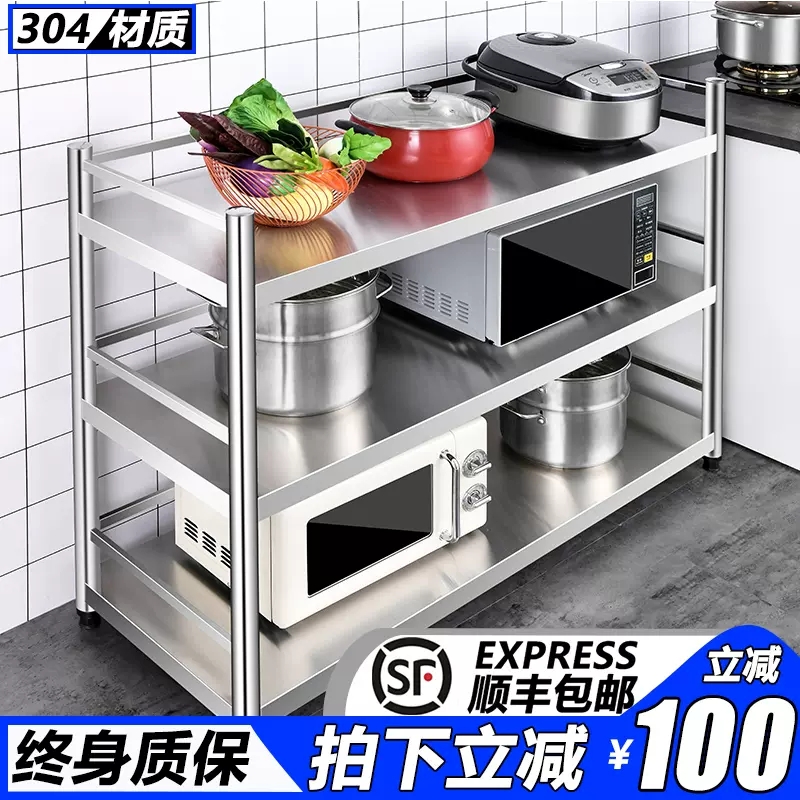 304不锈钢厨房置物架落地多层收纳锅架微波炉多功能3层带围栏加厚