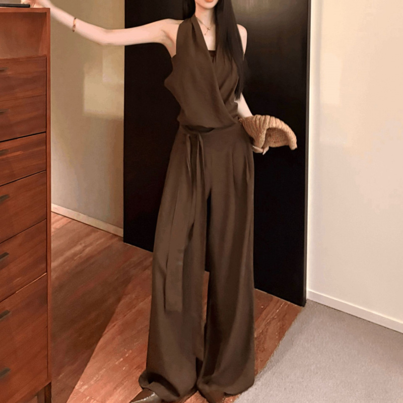 新款套装法式复古杏色挂脖背心女夏季宽松绑带阔腿裤休闲裤两件套