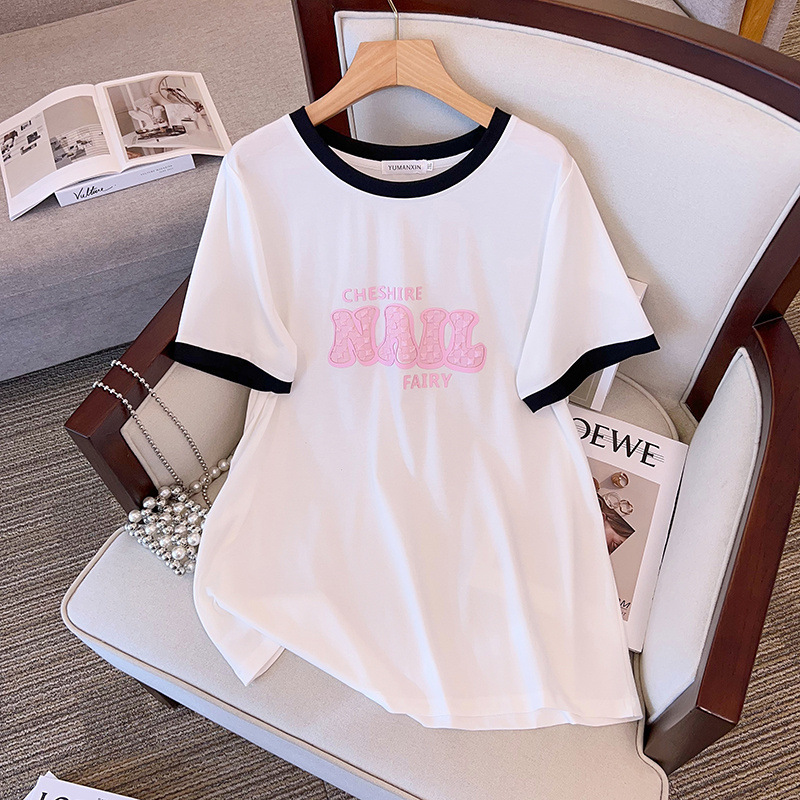 大码t恤女200斤短袖新款胖mm夏季宽松显瘦字母印花撞色圆领上衣潮
