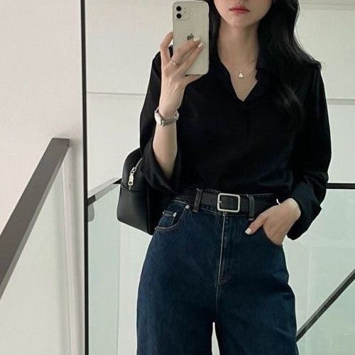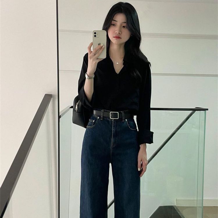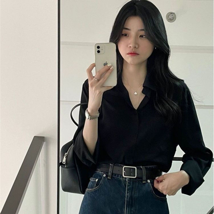 黑色衬衫女长袖春秋款设计感小个子休闲上衣宽松垂感衬衣女打底衫