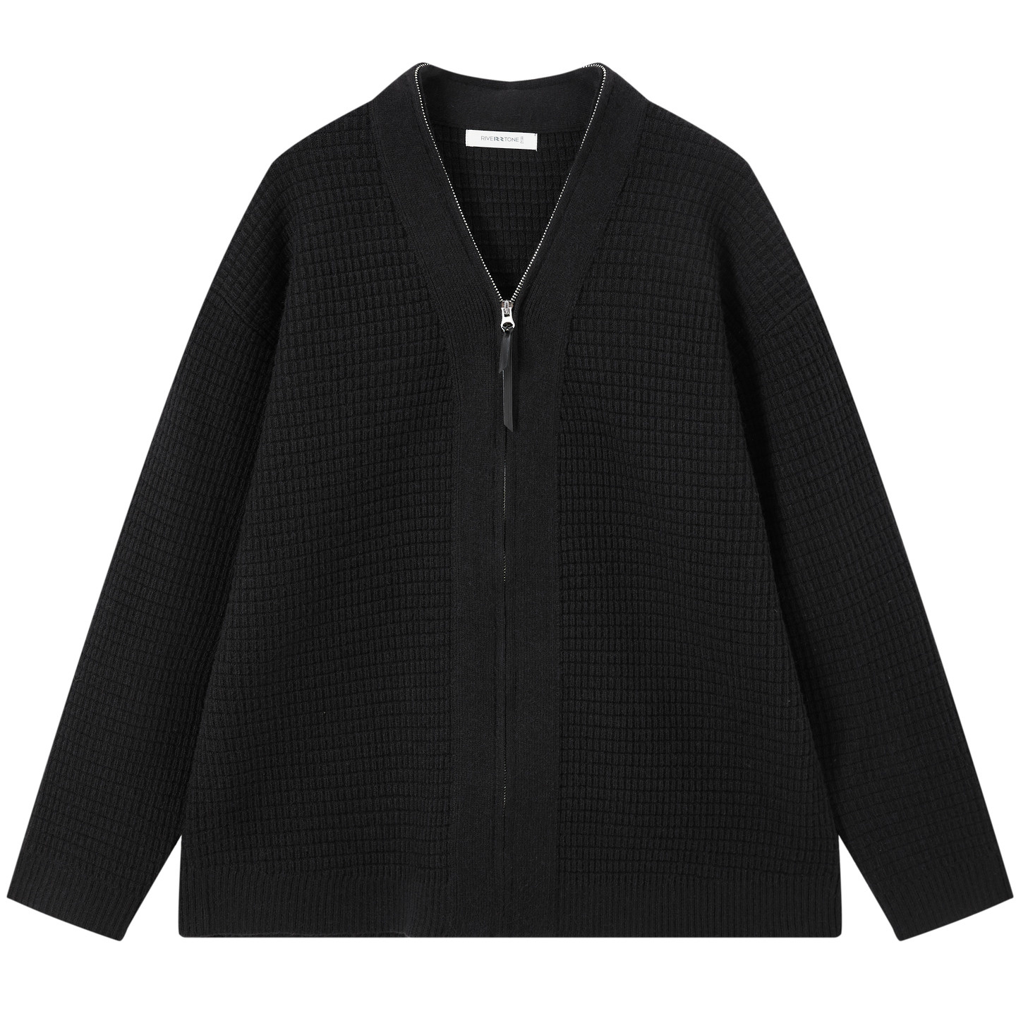 流石男装黑色设计感针织外套2025年冬季新款男款宽松拉链开衫毛衣