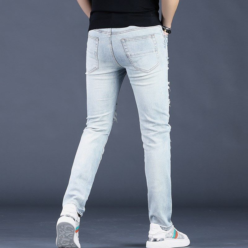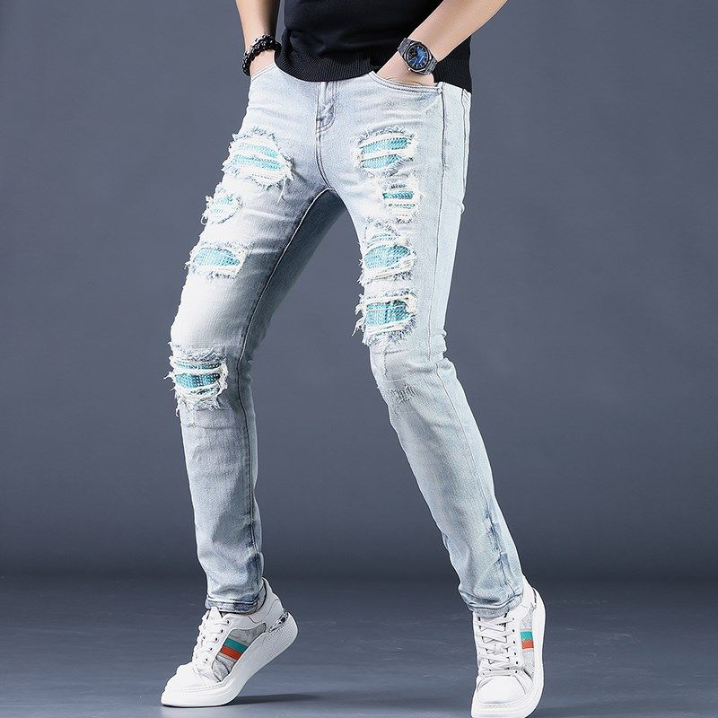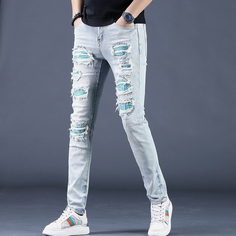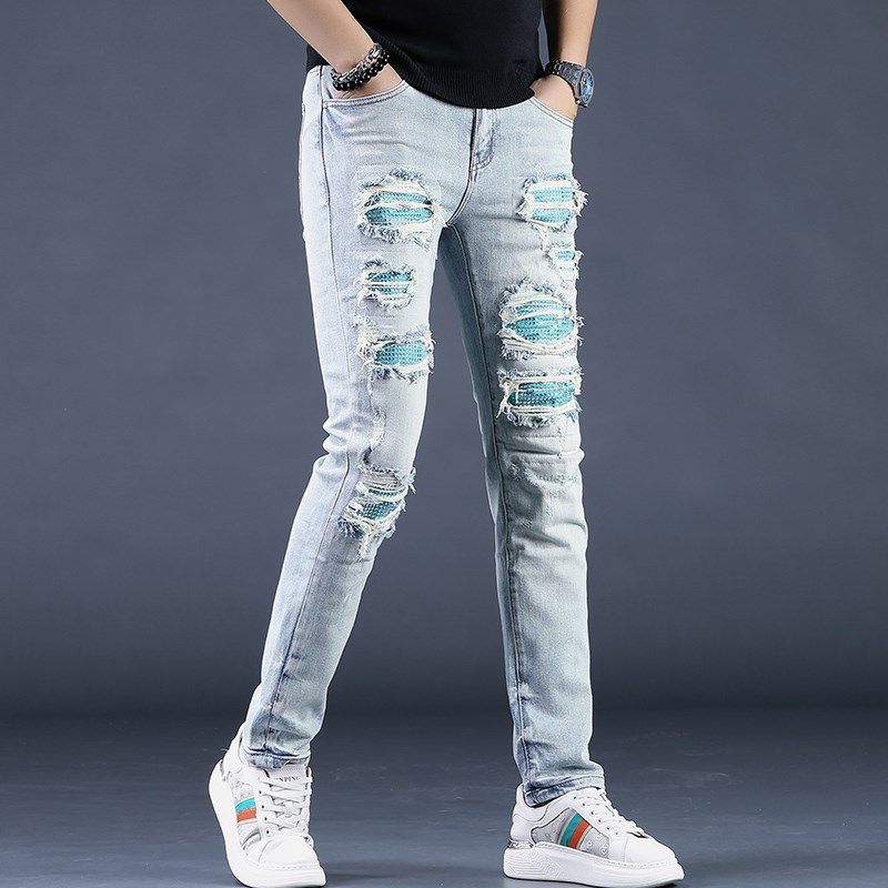 夏季男士蓝色破洞烫钻牛仔裤男潮牌修身百搭小脚休闲裤子韩版潮流