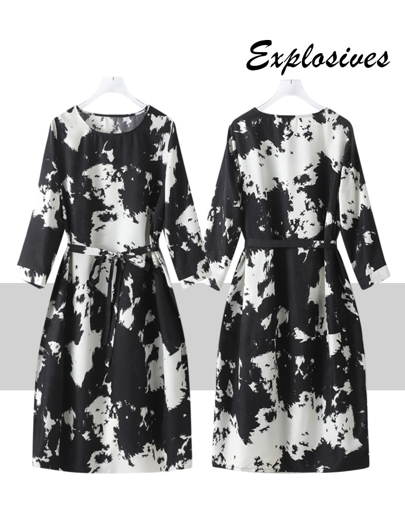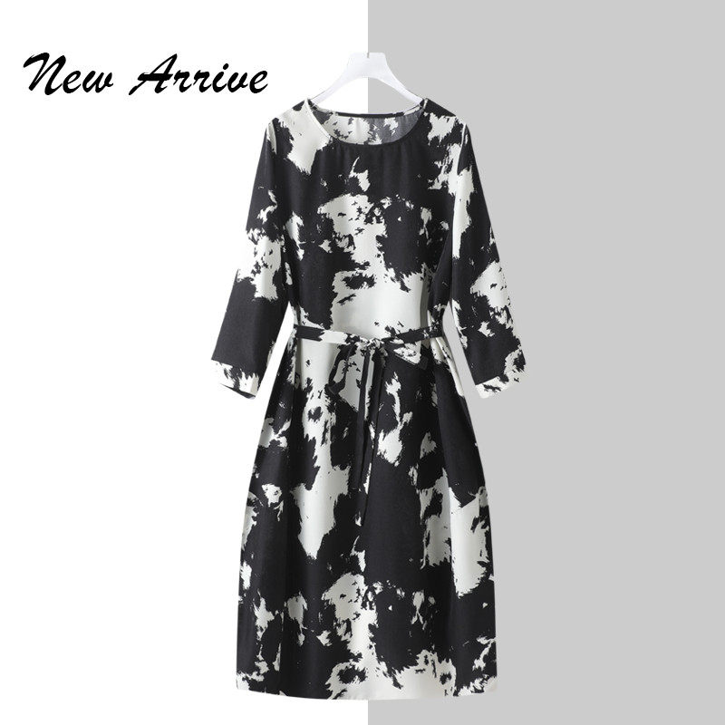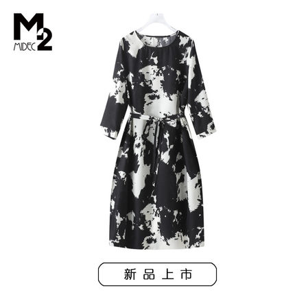 M2女装春秋新款宽松大码收腰显瘦微胖中年妈妈七分袖连衣裙