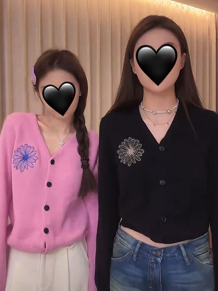 温婉同款小雏菊刺绣花朵V领羊毛针织开衫外套女纯色简约百搭上衣