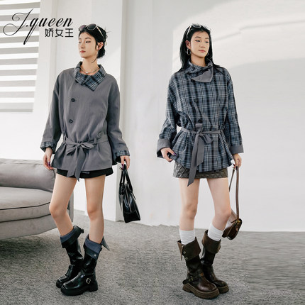 复古格纹拼接学院风两面穿束腰绑带风衣女春新款短款气质上衣外套
