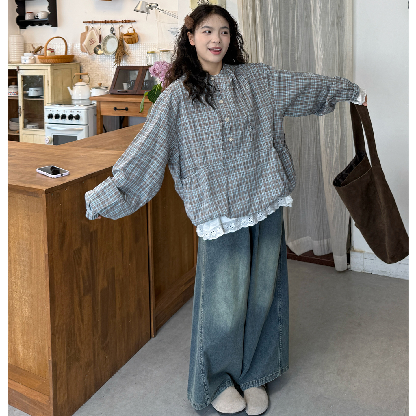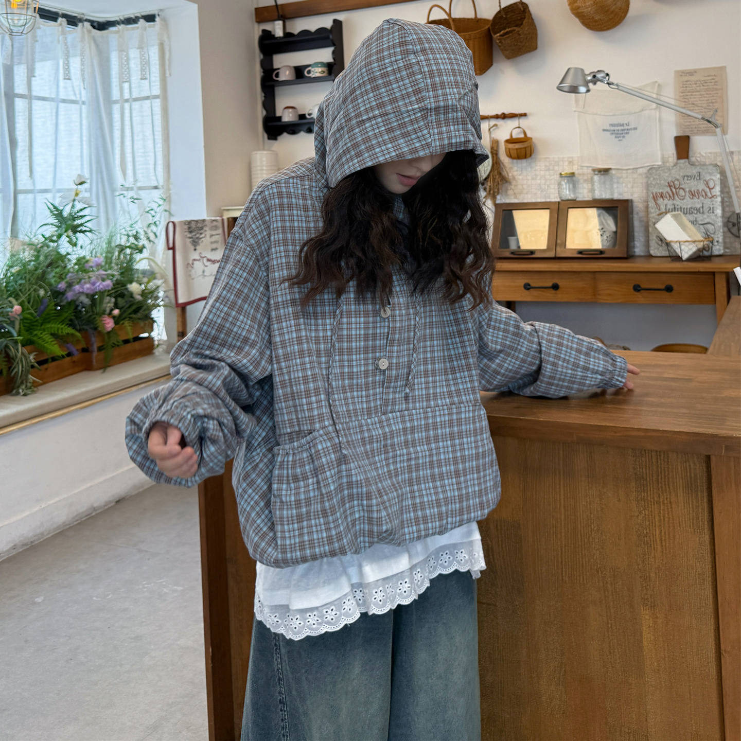 大码女装2025秋季胖mm韩版格子连帽上衣+花边白T+牛仔阔腿裤套装
