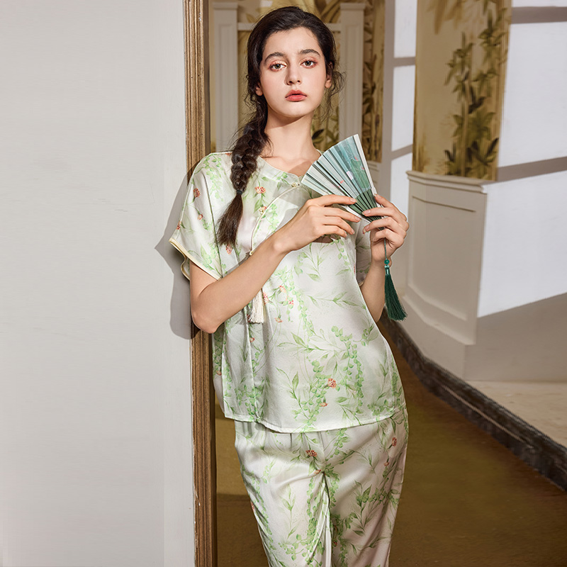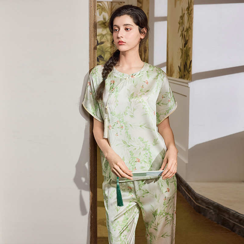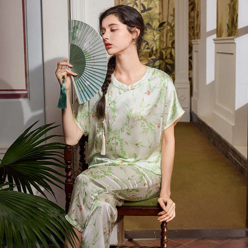 美标新款短袖真丝睡衣套装女夏重磅桑蚕丝新中式中国风丝绸家居服