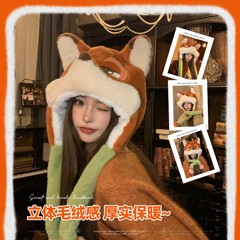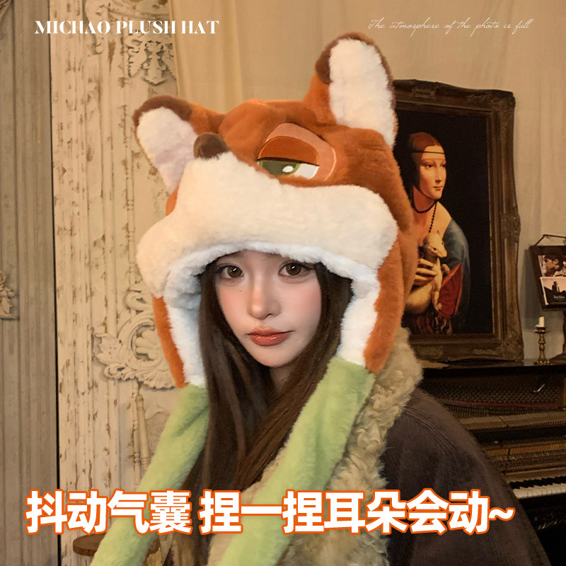 迪士尼火狐狸尼克帽子女耳朵会动冬季毛绒帽显脸小朱迪护耳套头帽