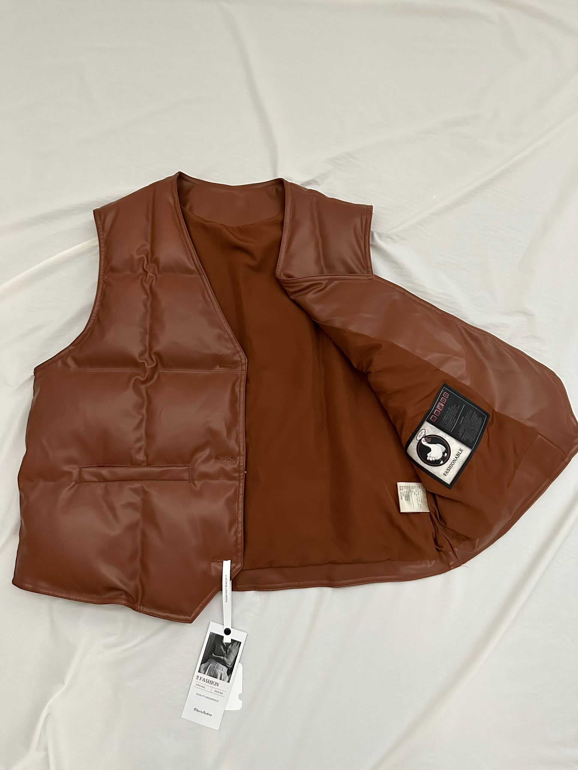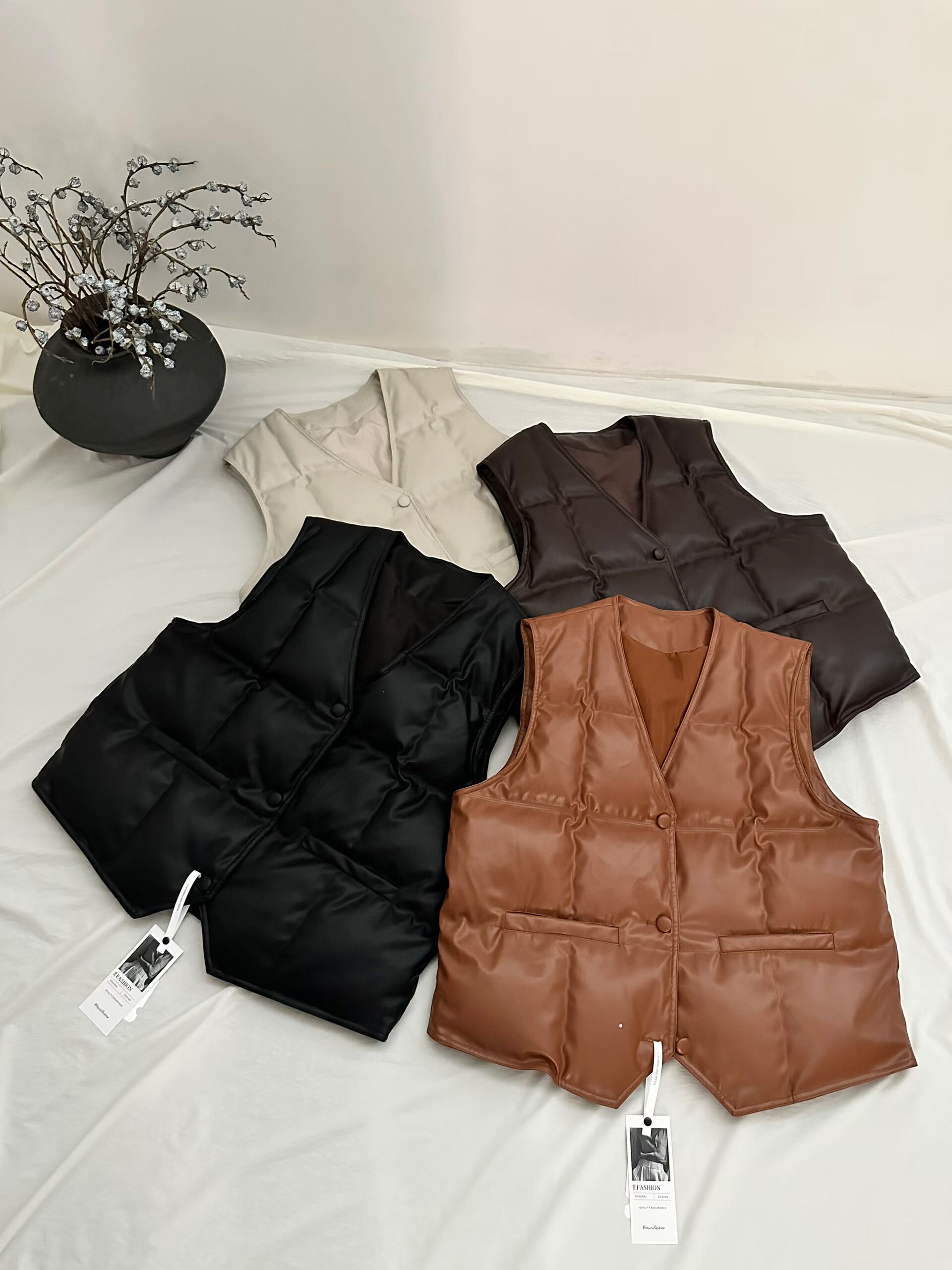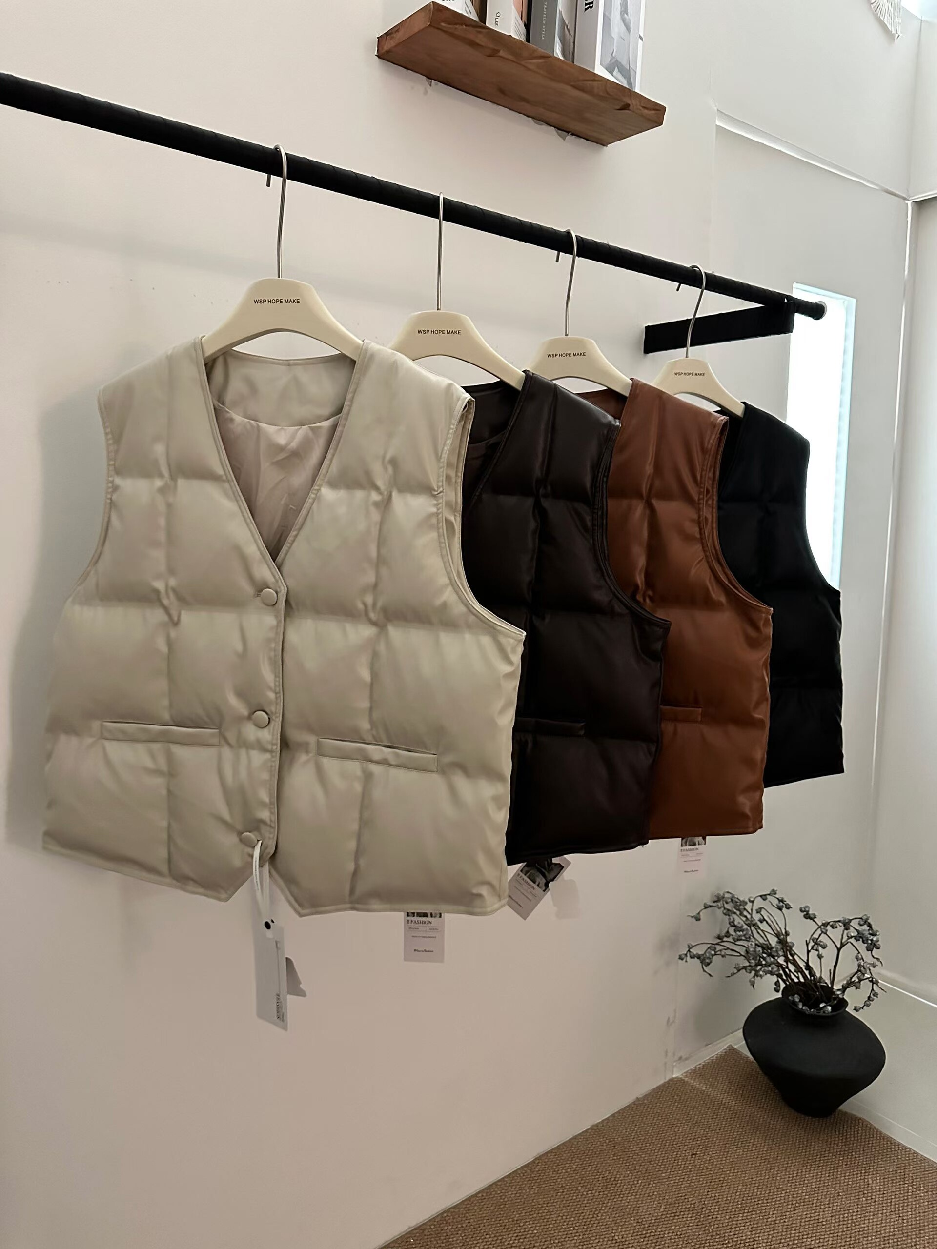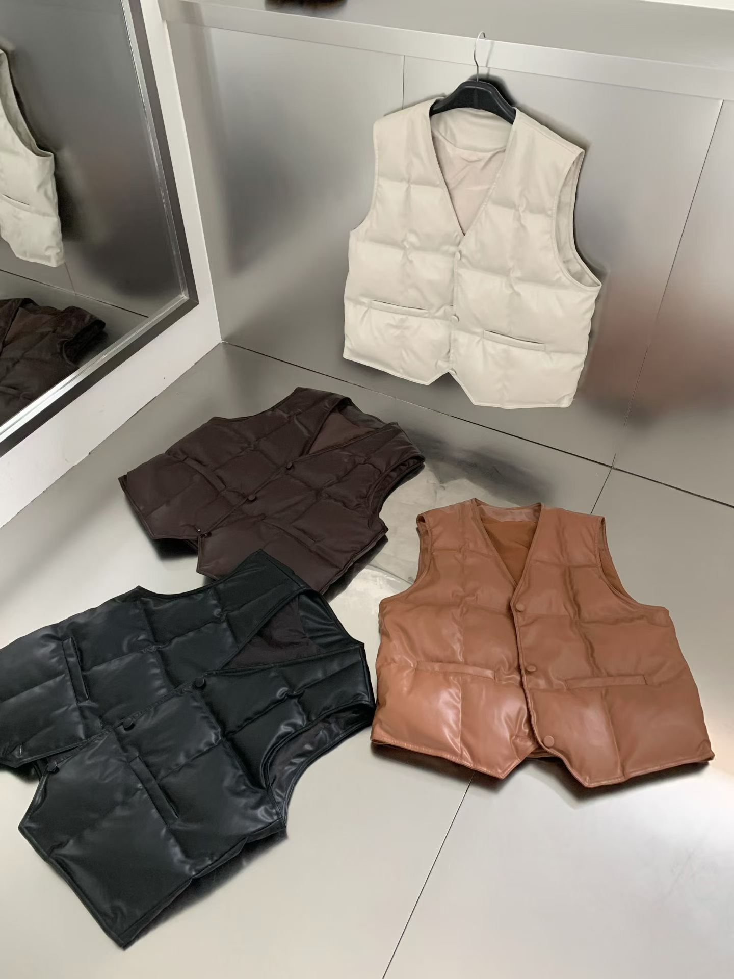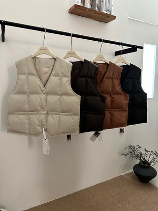 2025秋冬新款PU皮羽绒服女泡芙马甲宽松百搭马夹90白鸭绒外套潮