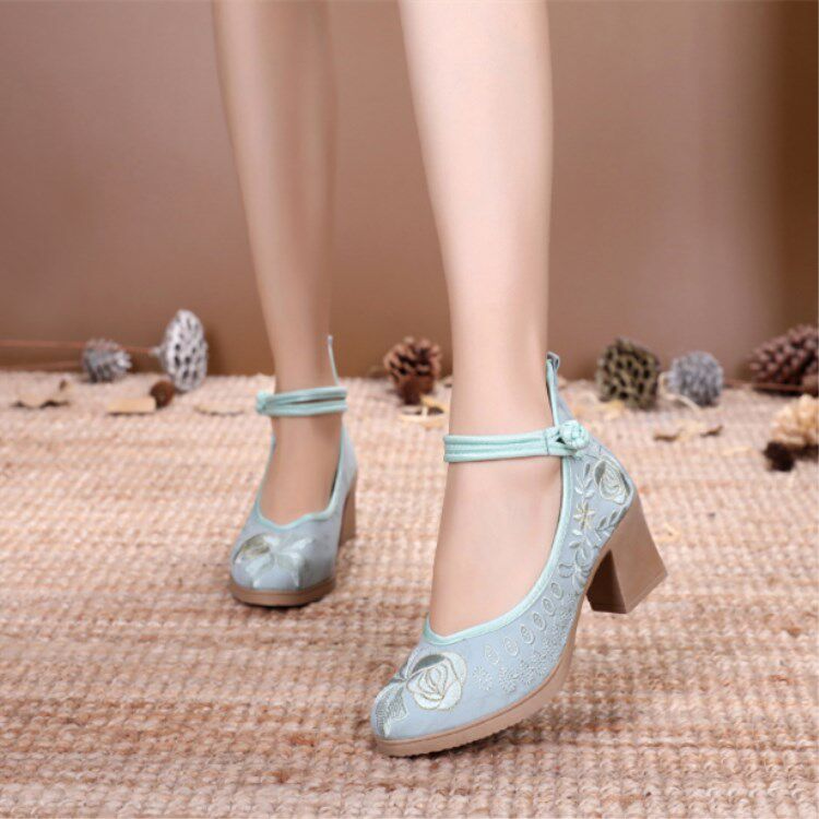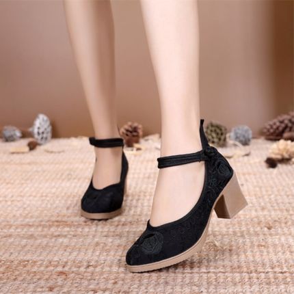 汉服鞋子女古风高跟老北京布鞋民族风绣花鞋女粗跟旗袍茶艺师单鞋