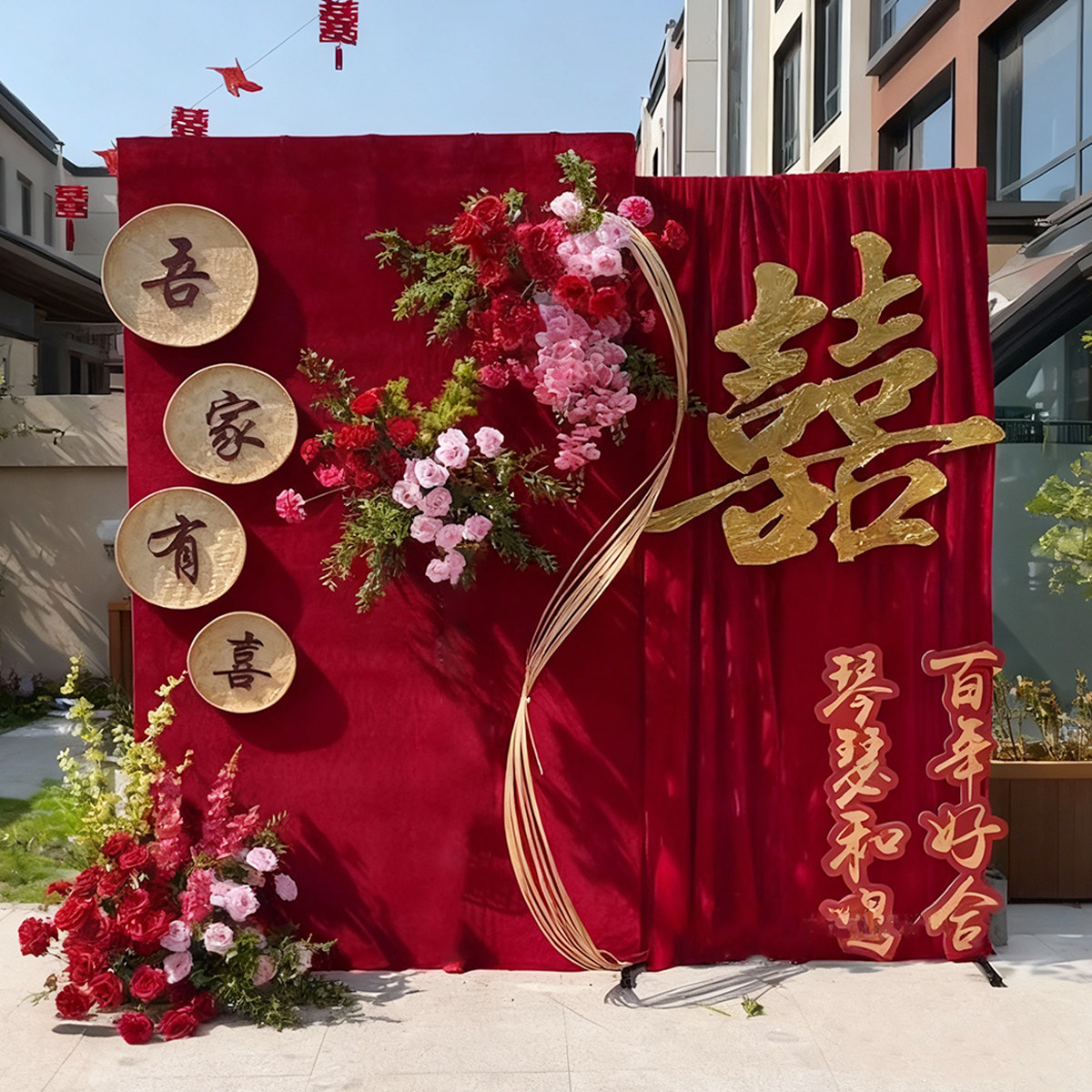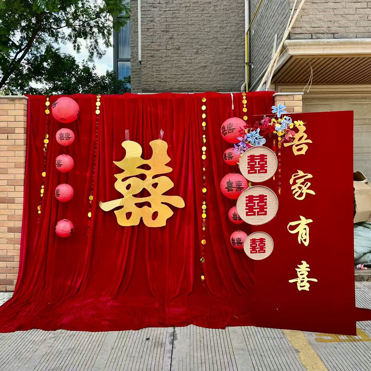 订婚宴中式布幔结婚红色金丝绒背景布舞台现场布置纱幔庭院婚礼