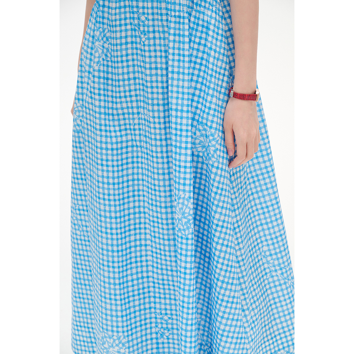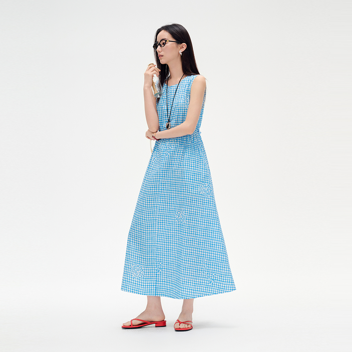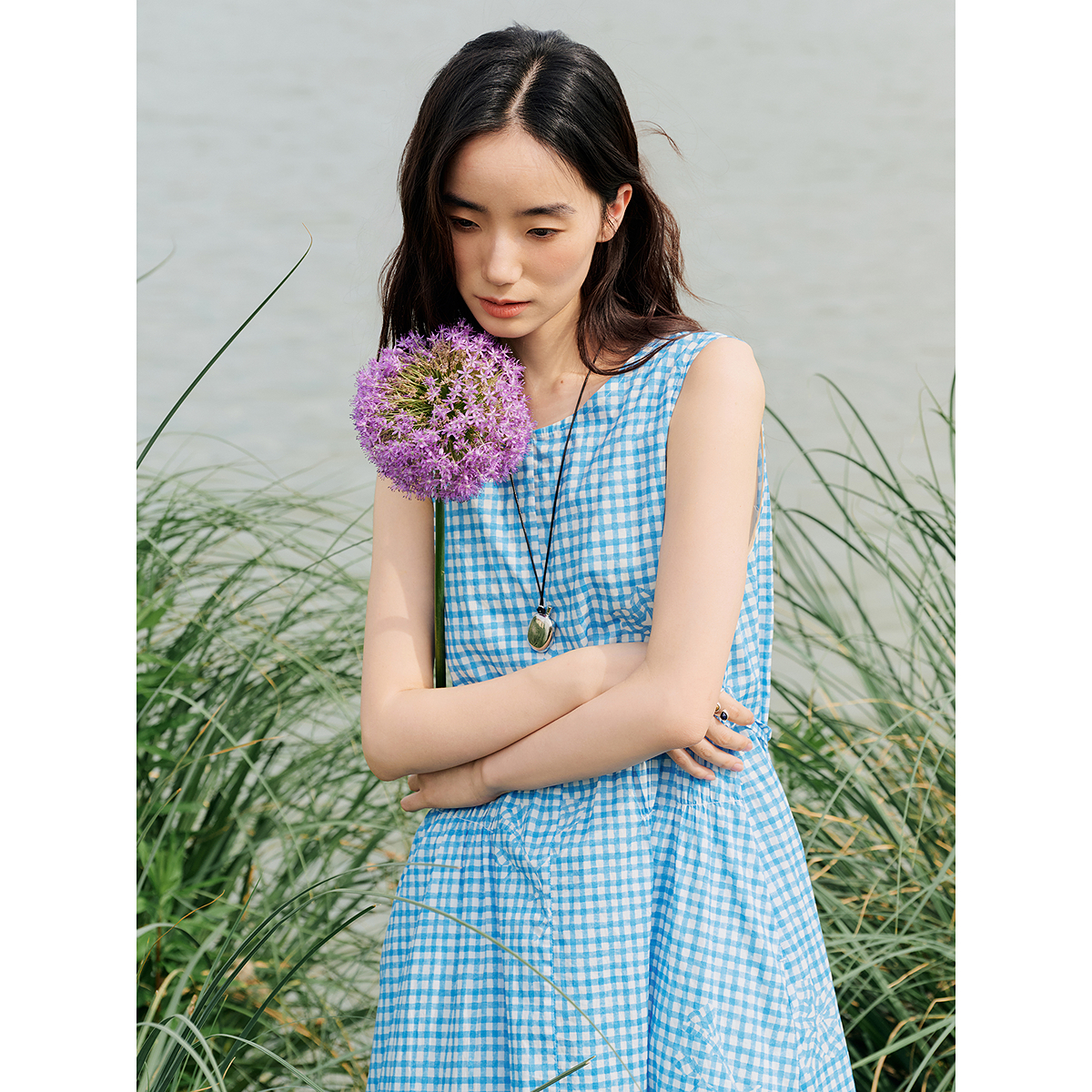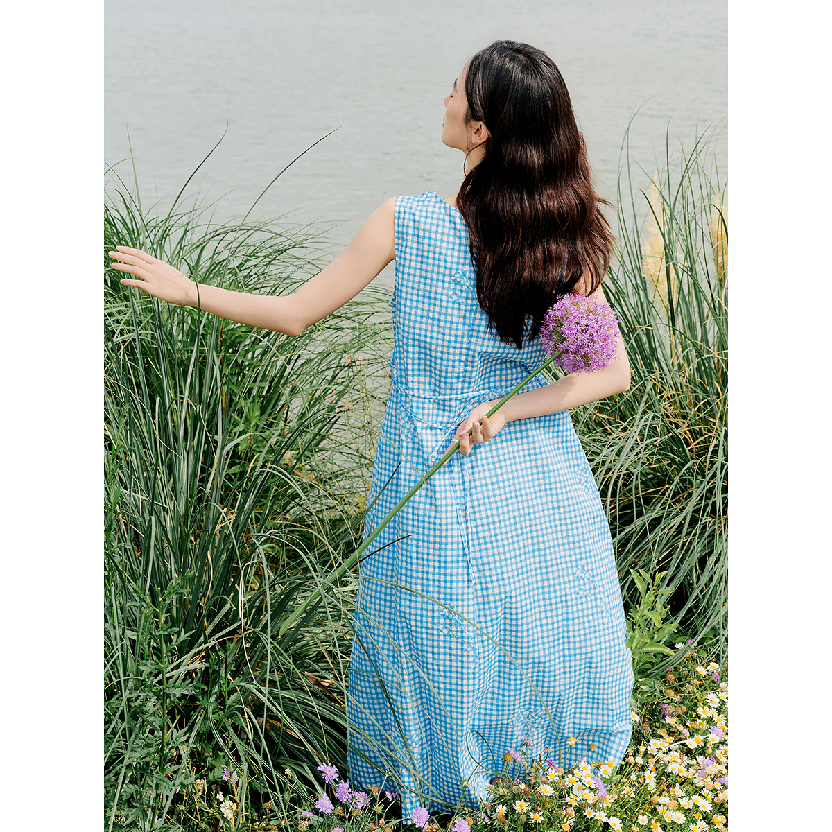 飞鸟和新酒纯棉无袖格纹连衣裙2025夏新款中长印花海边度假风女裙