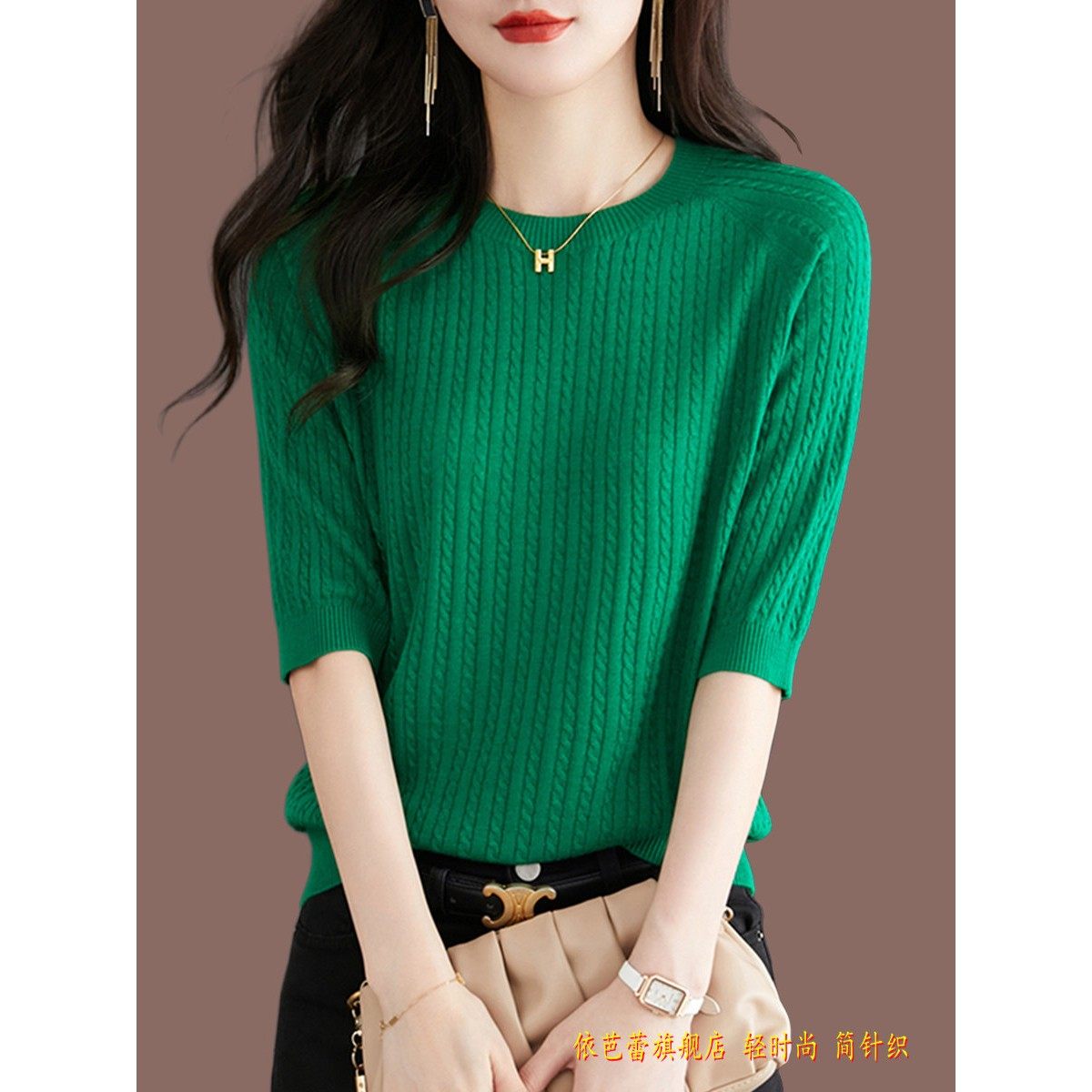 早秋七分袖羊毛小衫女中袖t恤春秋妈妈针织打底衫纯色麻花毛衣薄