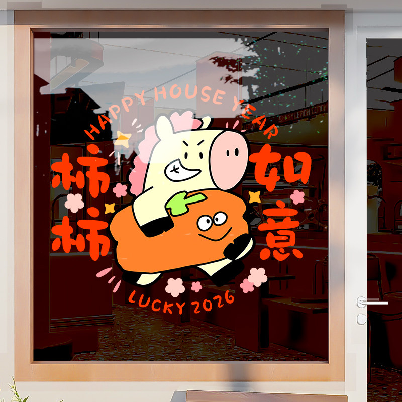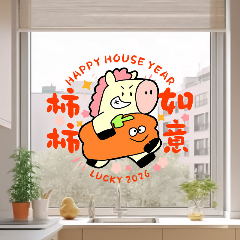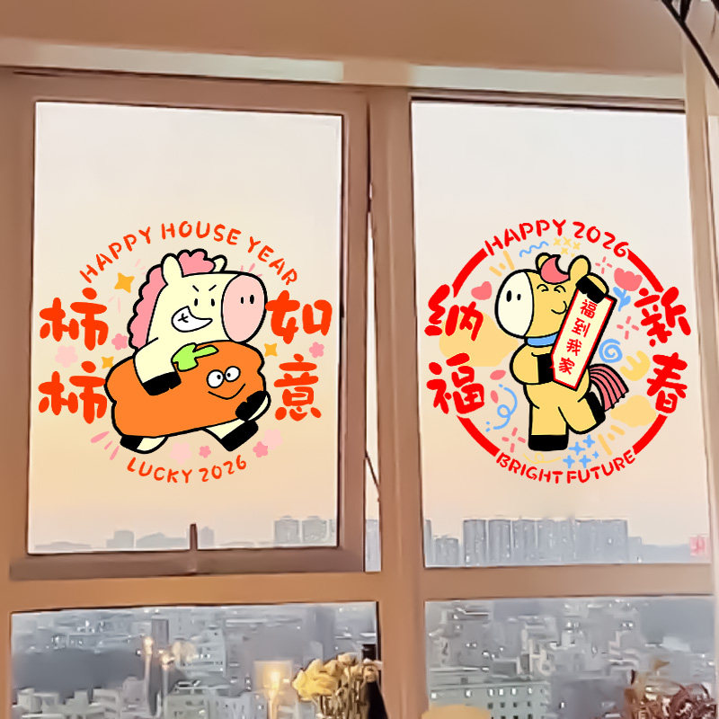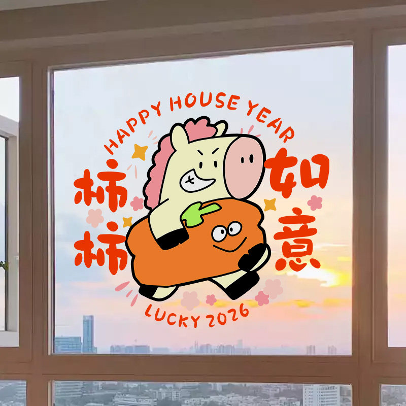 2026新年装饰马年春节柿柿如意窗花过年家用卧室节日玻璃贴纸静电