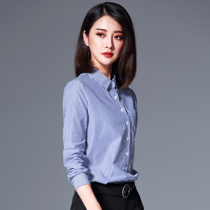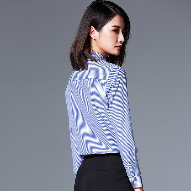 竖条纹衬衫女长袖上衣春秋法式别致新款气质新款职业时尚纯棉衬衣