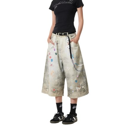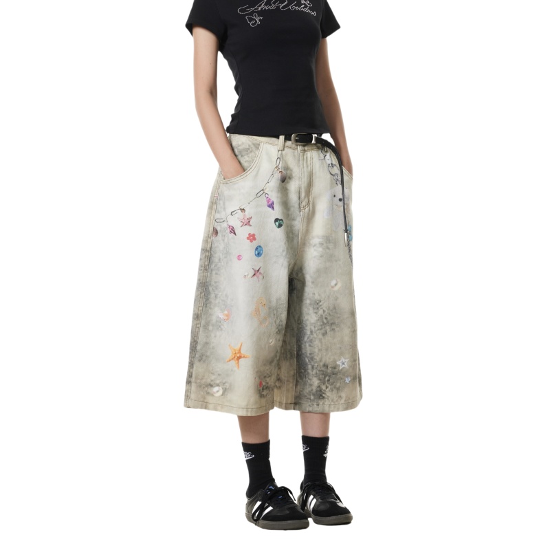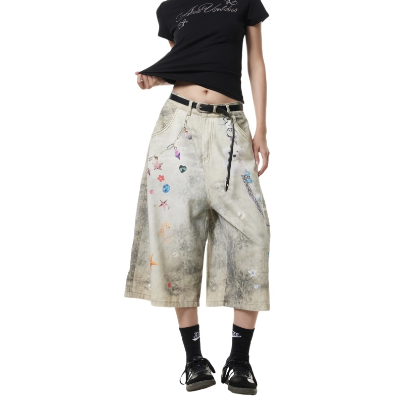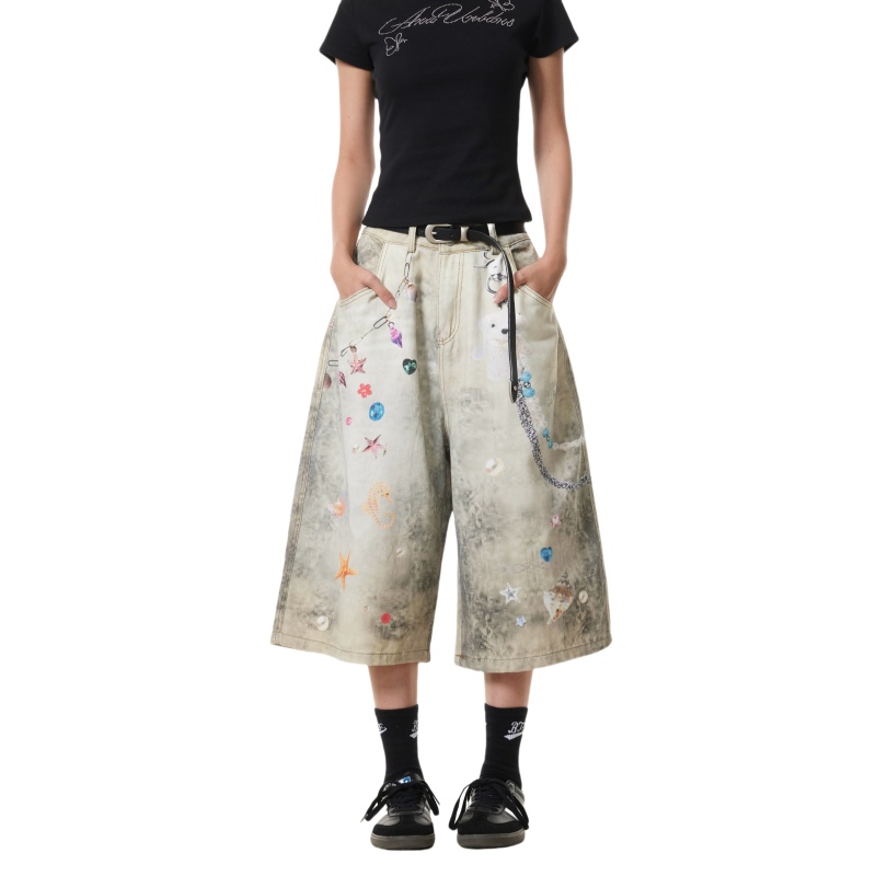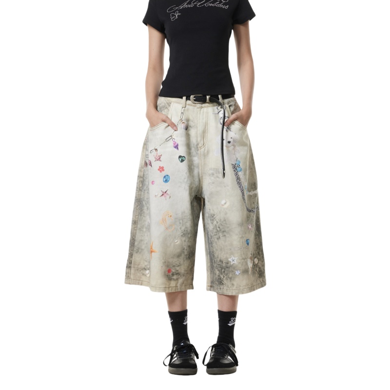 BTSG“做旧泼墨3D数码印花链条牛仔短裤”baggy宽松阔腿七分裤潮