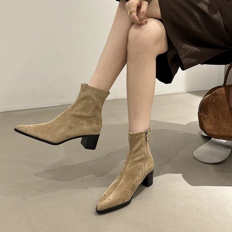 qihaoyouchai尖头靴子短靴女粗跟短筒靴马丁靴绒面靴瘦瘦靴