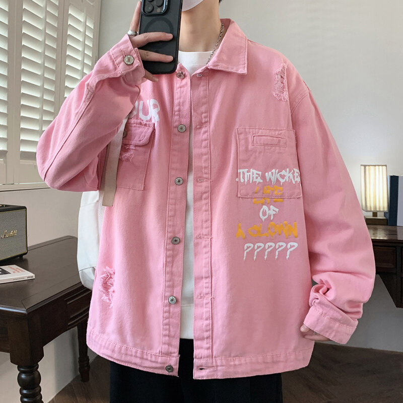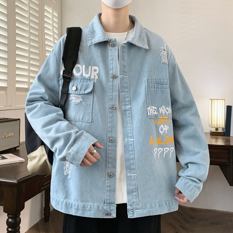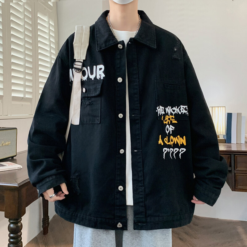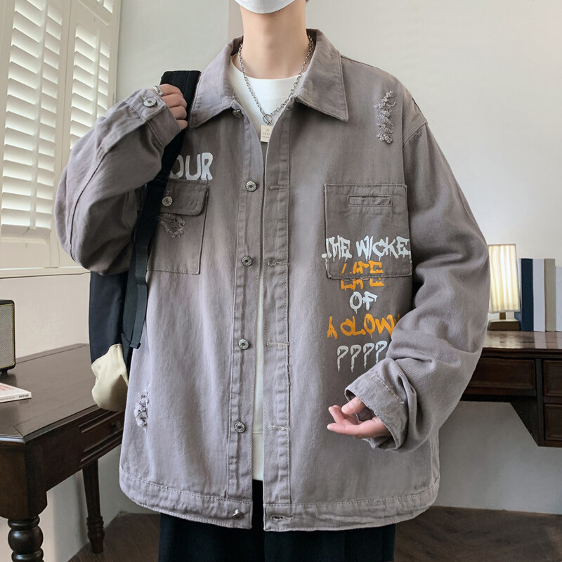 牛仔外套男款2026春秋季休闲宽松印花工装夹克潮牌帅气上衣服以純
