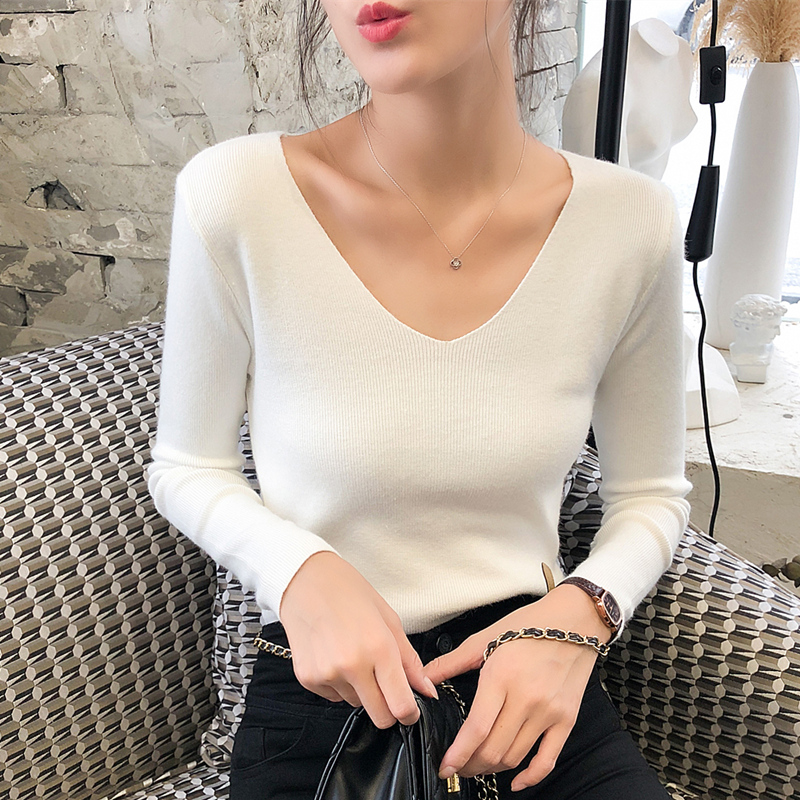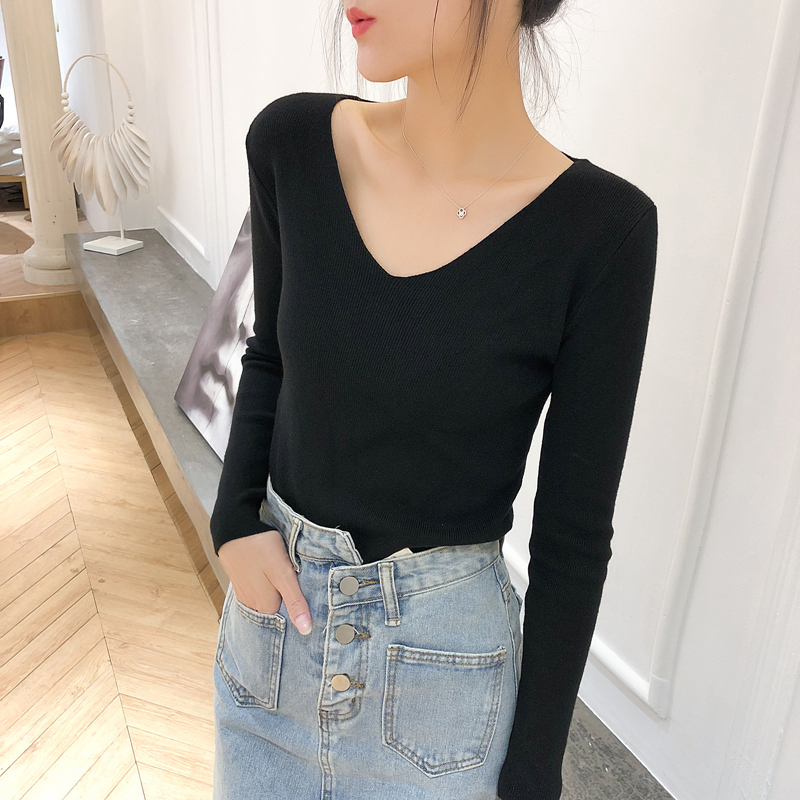 秋冬2023新款V领内搭长袖针织衫上衣春秋薄款低领毛衣女士打底衫