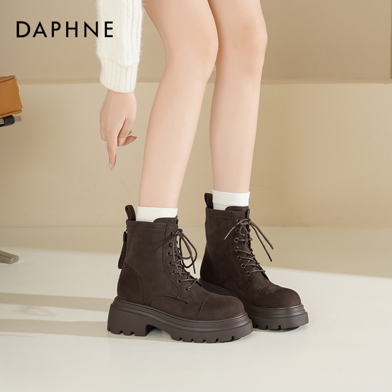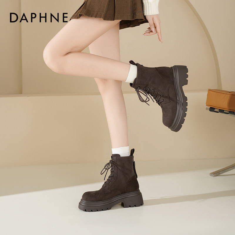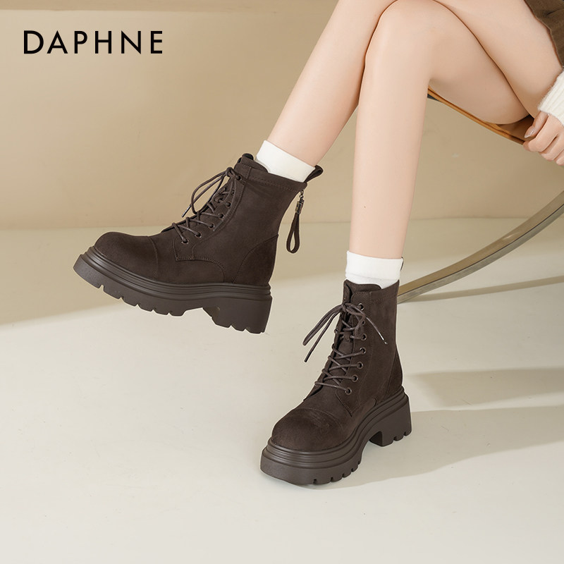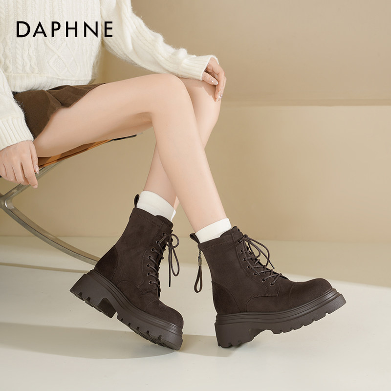 达芙妮马丁靴女2025新款秋冬英伦风中筒靴厚底增高加绒棕色短靴子