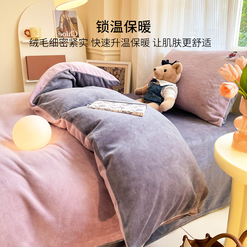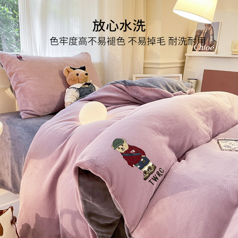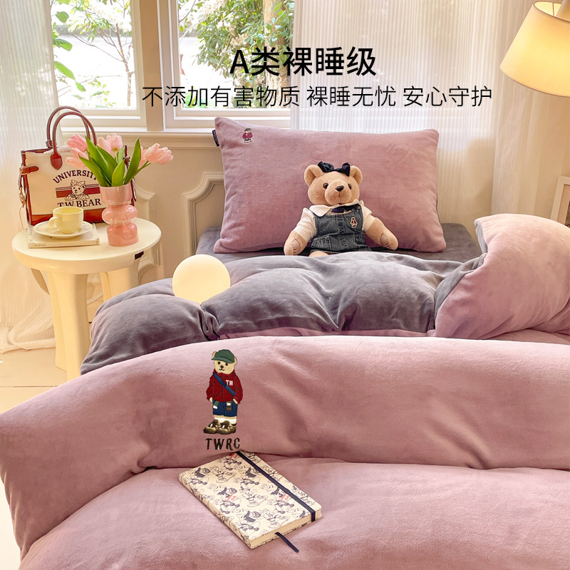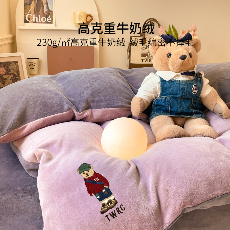 TeenieWeenie小熊紫色冬季牛奶绒四件套加厚法兰绒宝宝绒被套床单