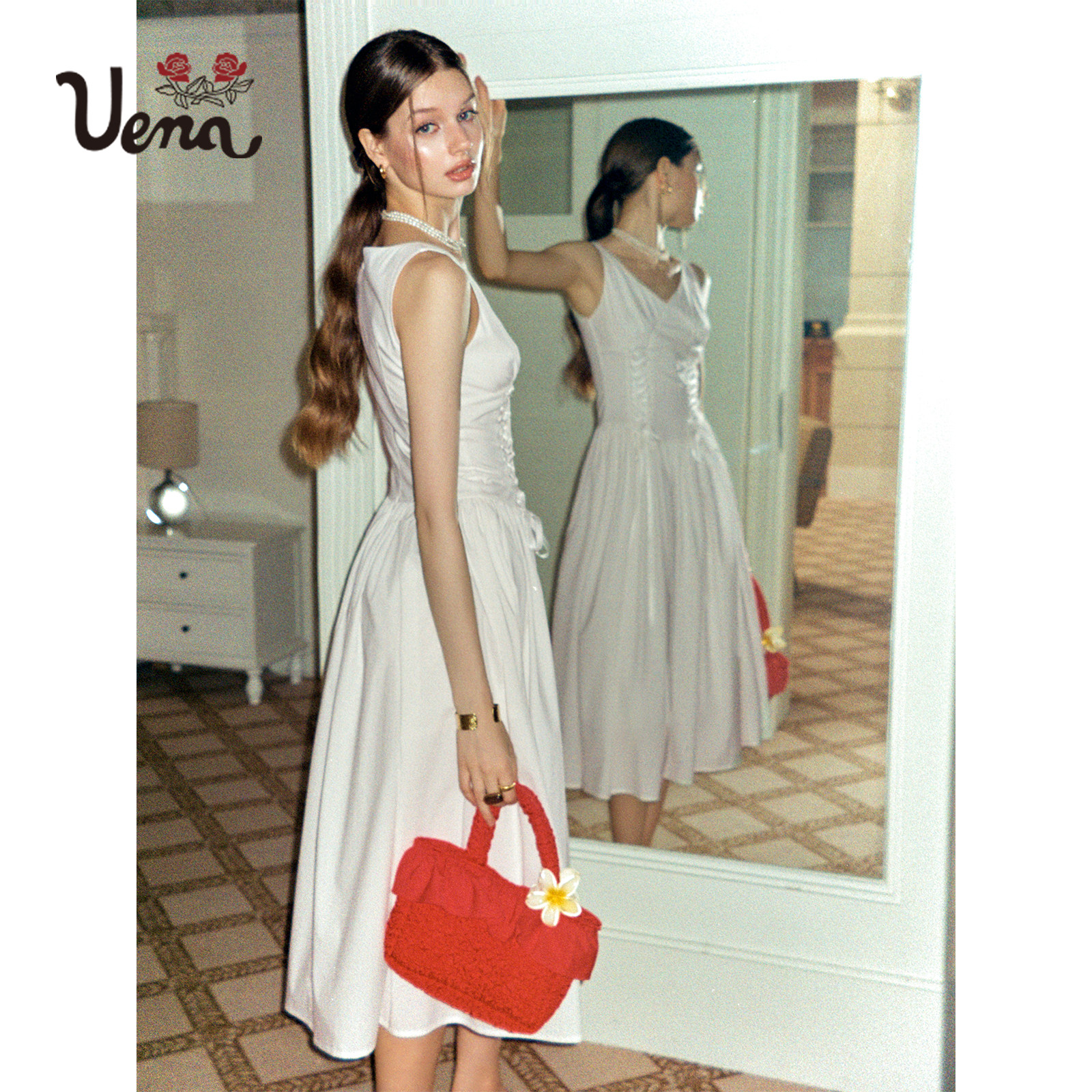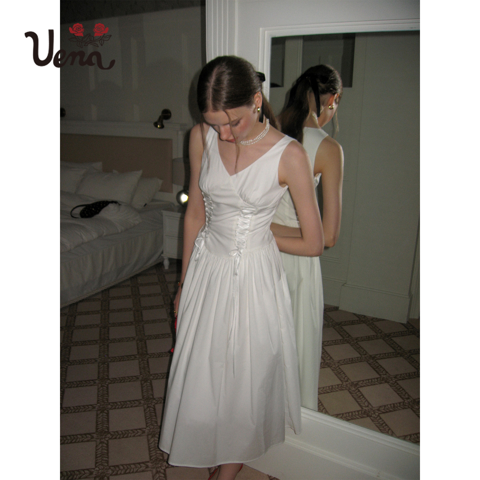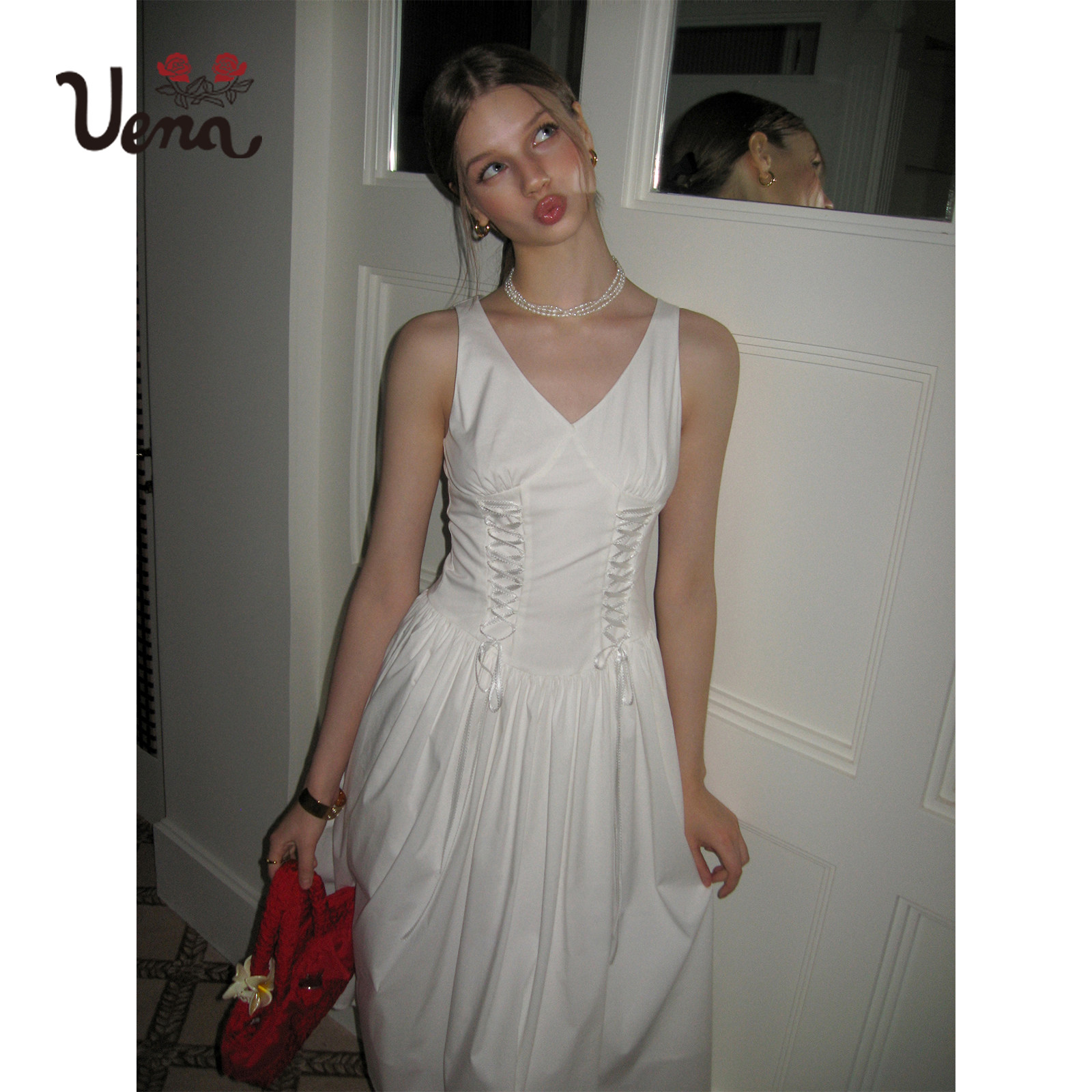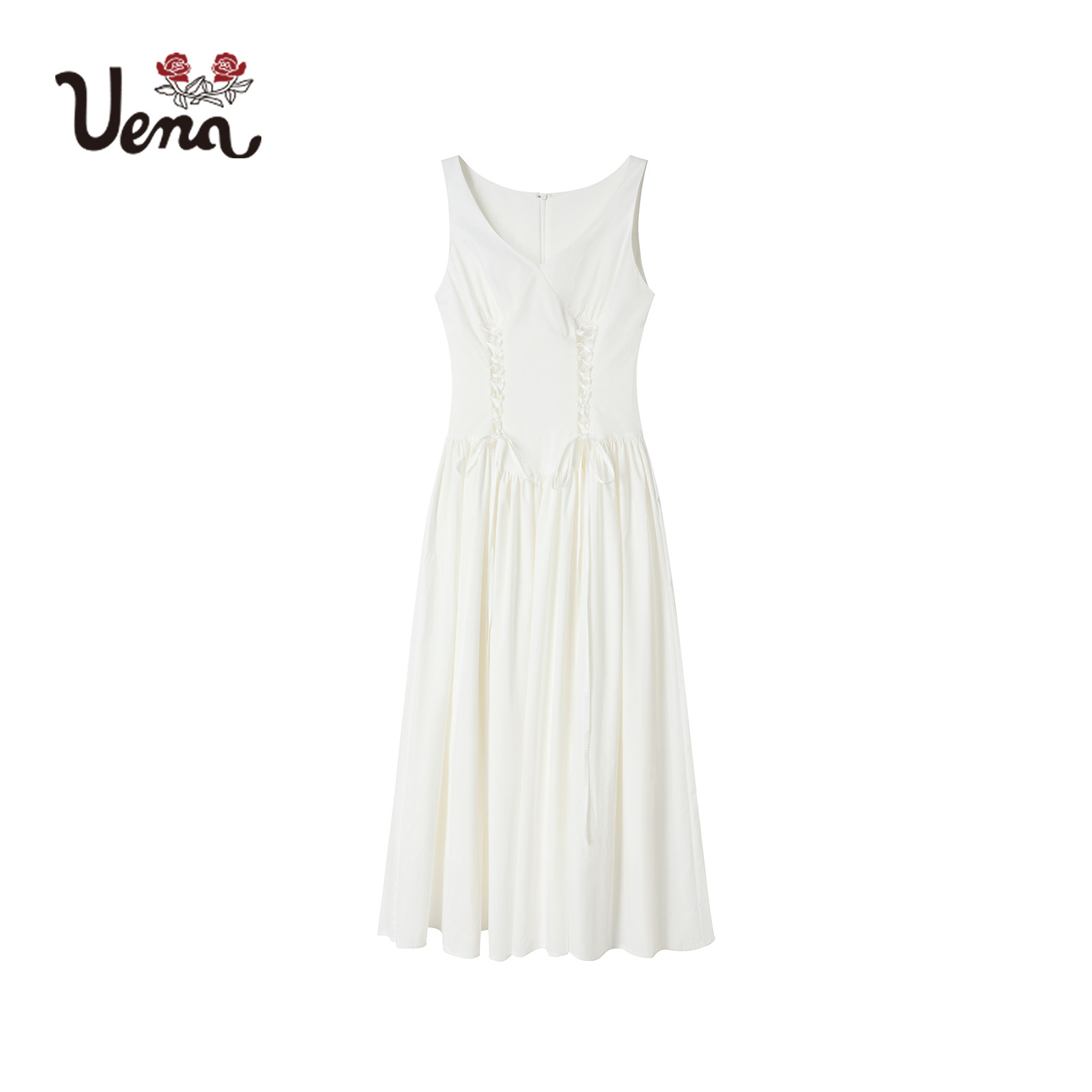 【梦中的蝴蝶】Uena白色腰部抽褶抽绳绑带A字长款v领背心连衣裙女