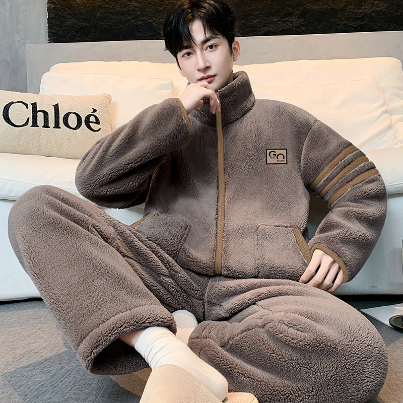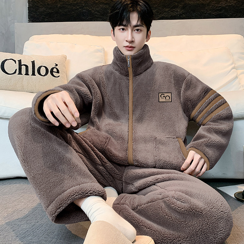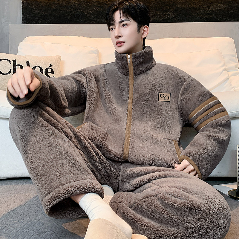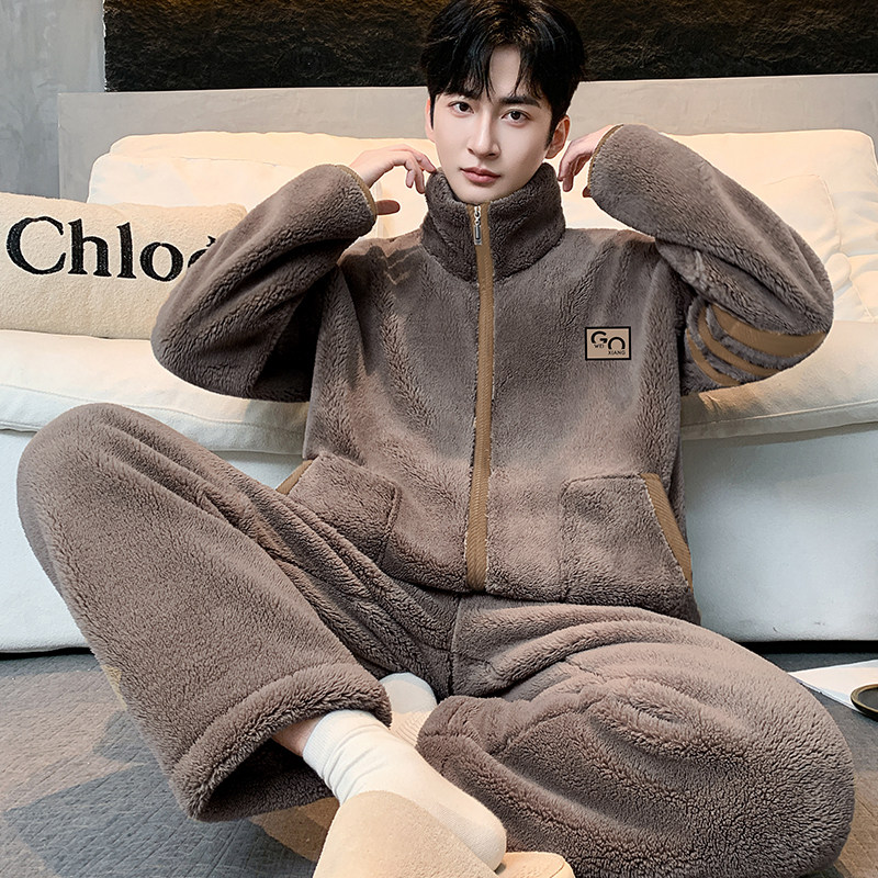 可外穿秋冬天男青年宽松大码暖绒保暖法兰绒家居服睡衣休闲套装