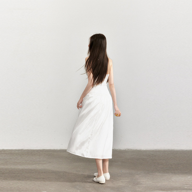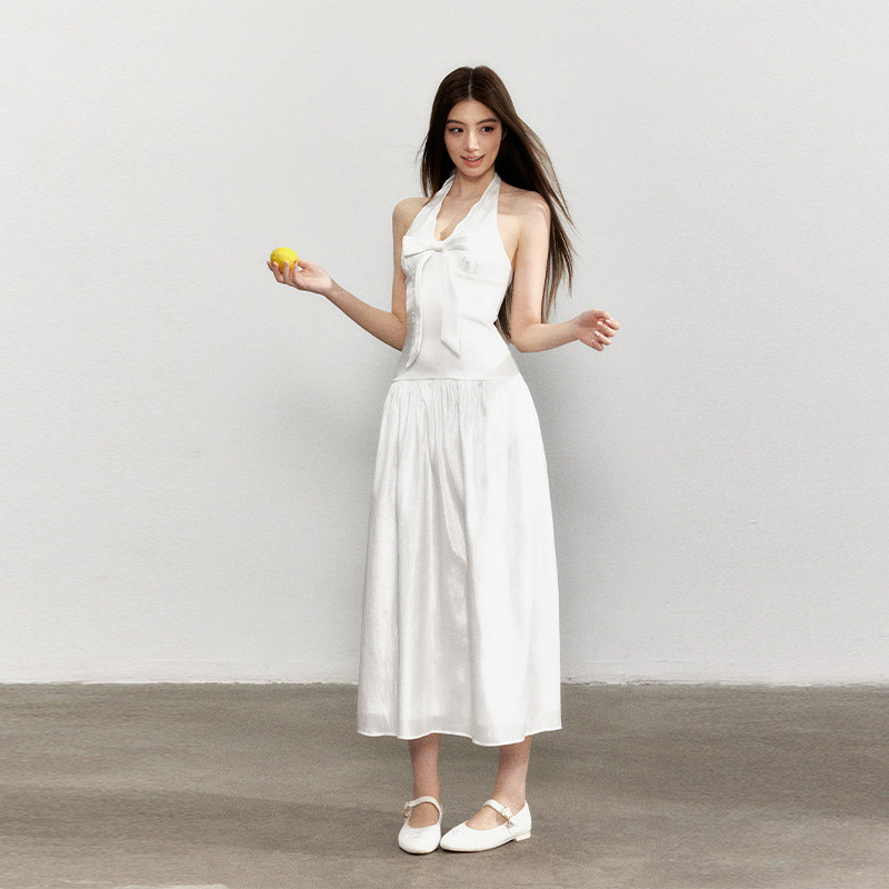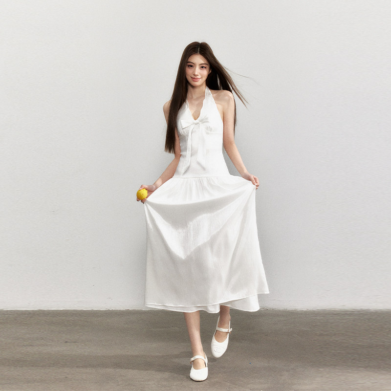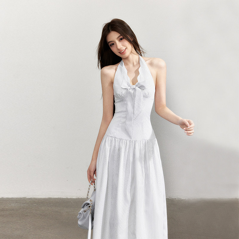 aokidoki 伯德小姐 蓝色条纹挂脖连衣裙女V领蝴蝶结收腰吊带长裙