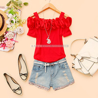 法式时尚女装夏韩版短袖t恤百搭显瘦花朵一字领露肩性感修身上衣