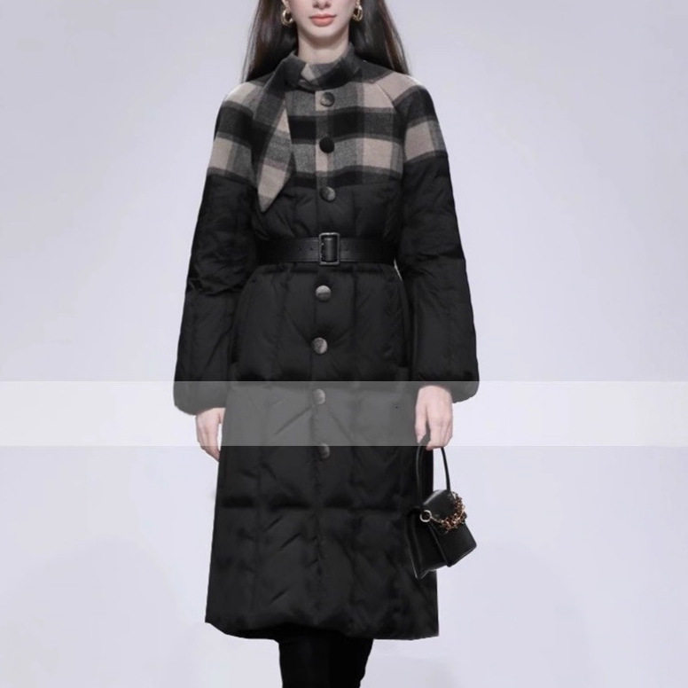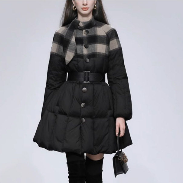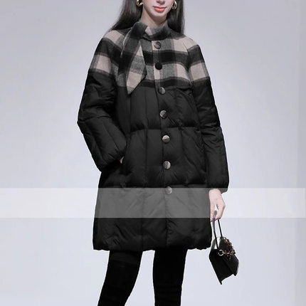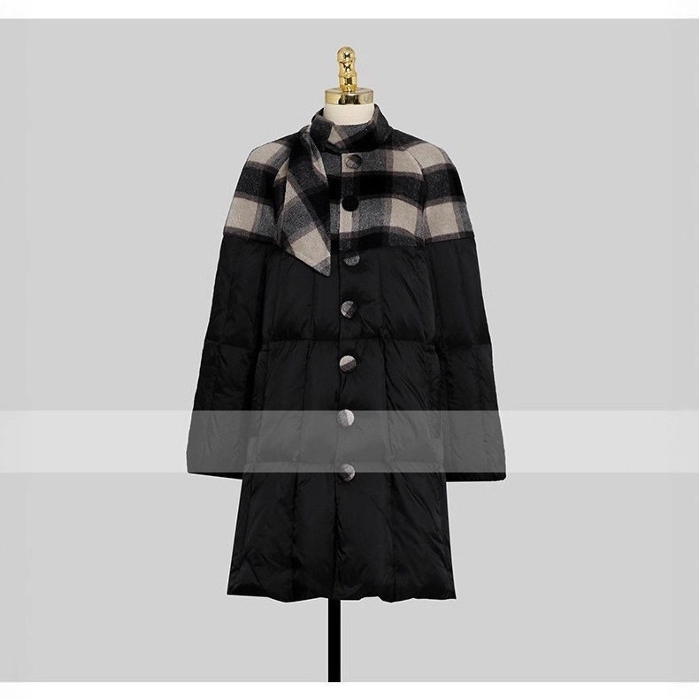 冬季新款气质优雅立领自带领巾连肩袖面料拼接灯笼袖羽绒服女