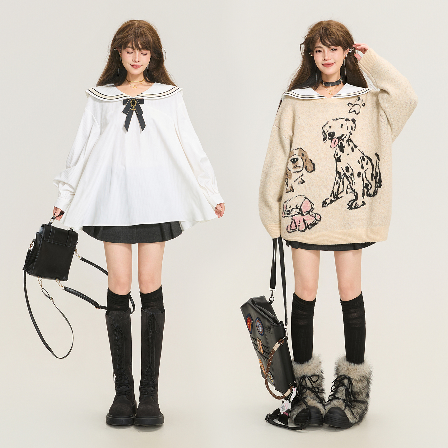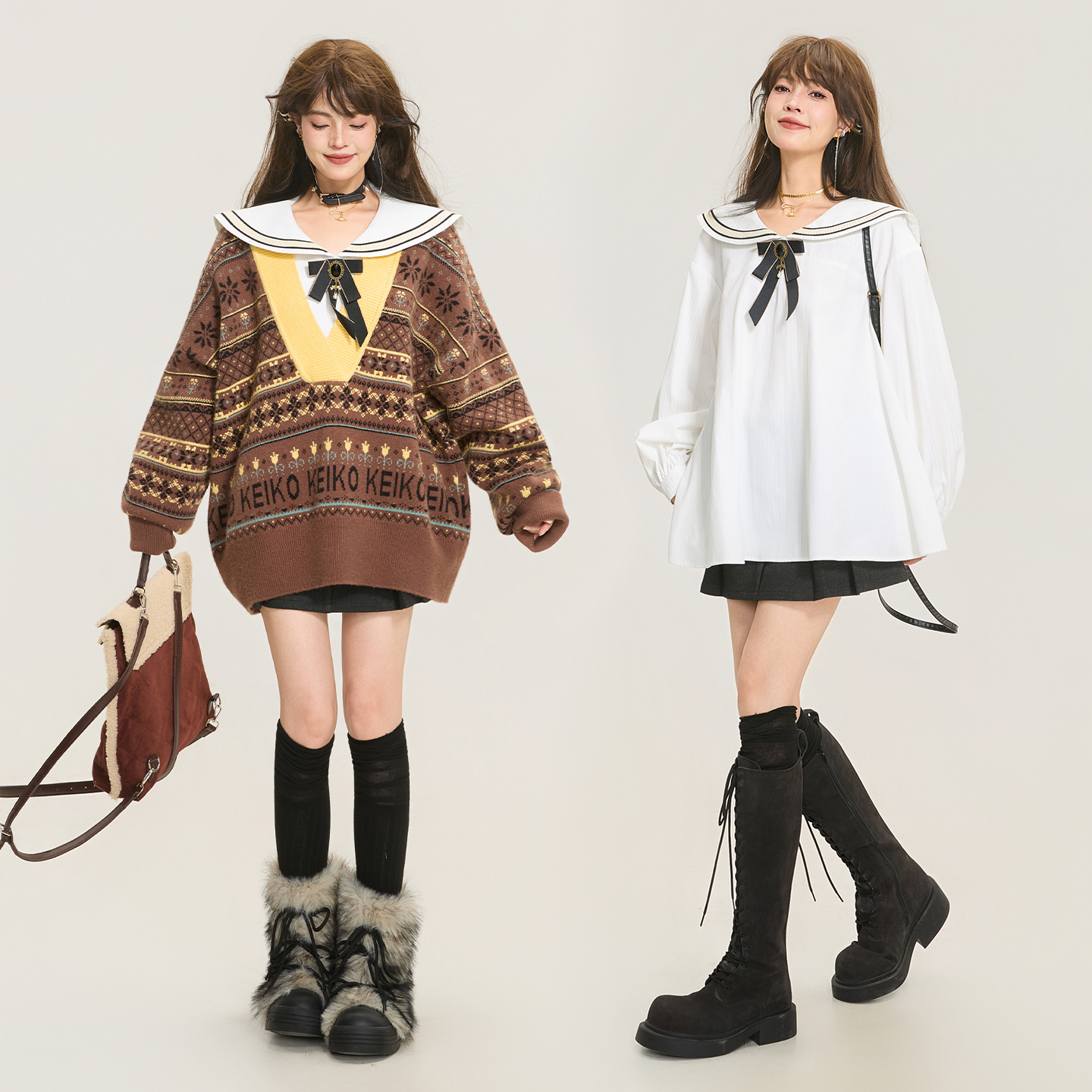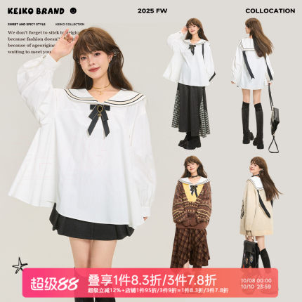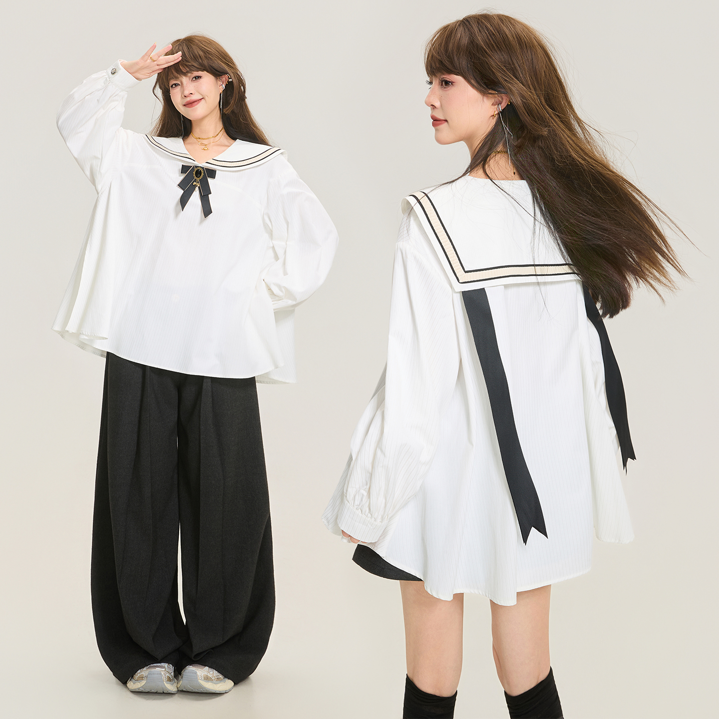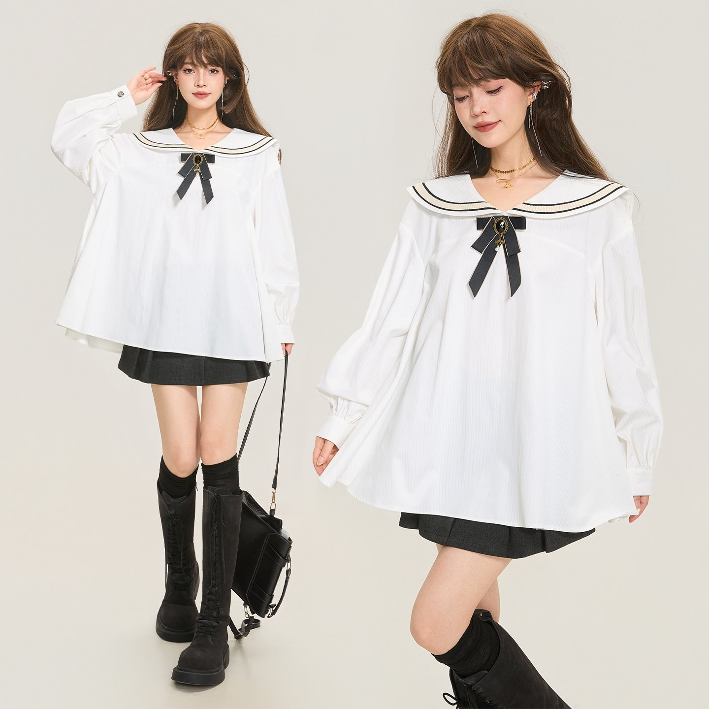 KEIKO [莱赛尔] 法式海军领白色长袖衬衫25秋季洋气减龄通勤上衣