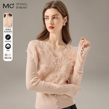 2025秋季新款漂亮气质蕾丝花边打底上衣V领收腰针织衫毛衣女薄款