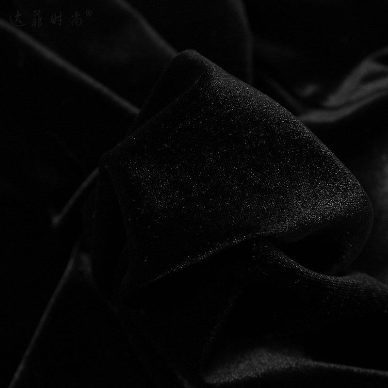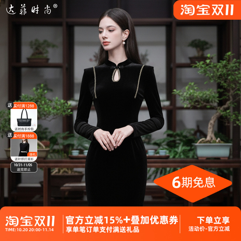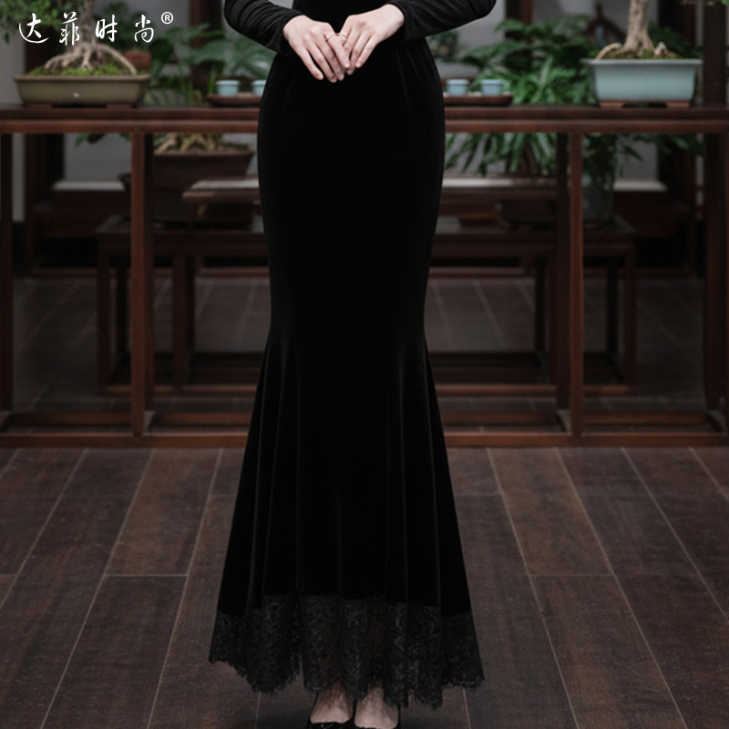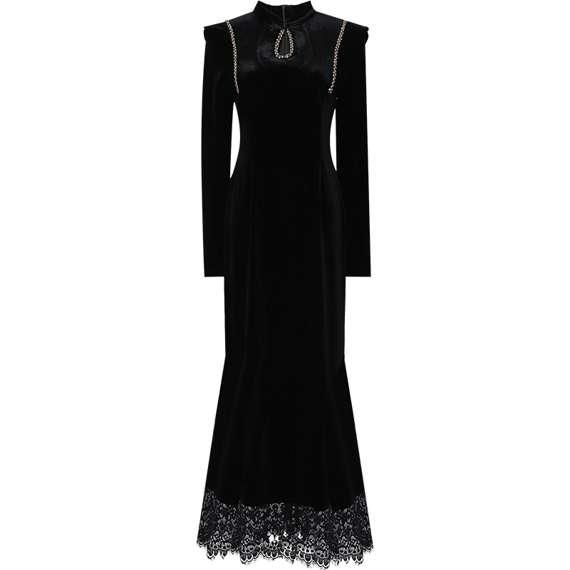 2025冬季新款新中式立领漏洞设计花边飞肩收腰鱼尾长款丝绒连衣裙