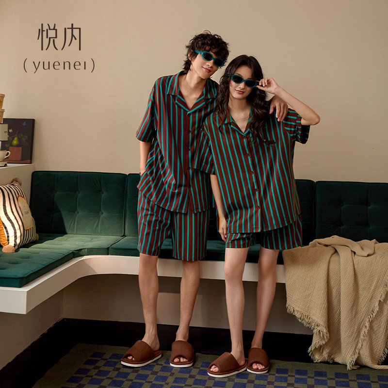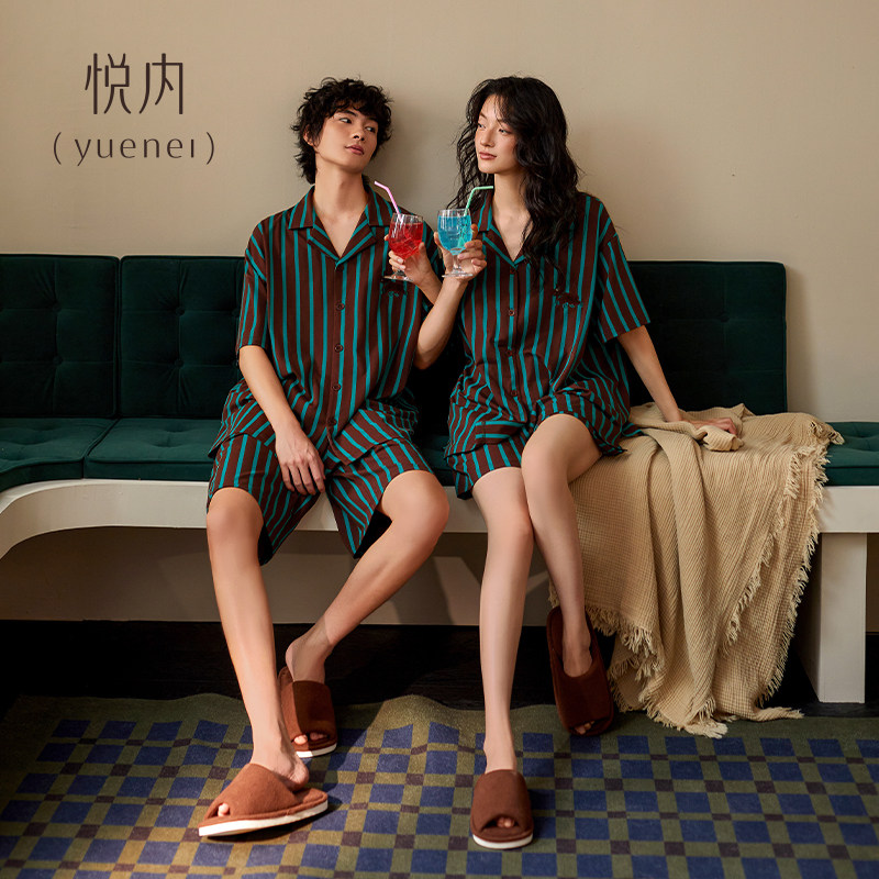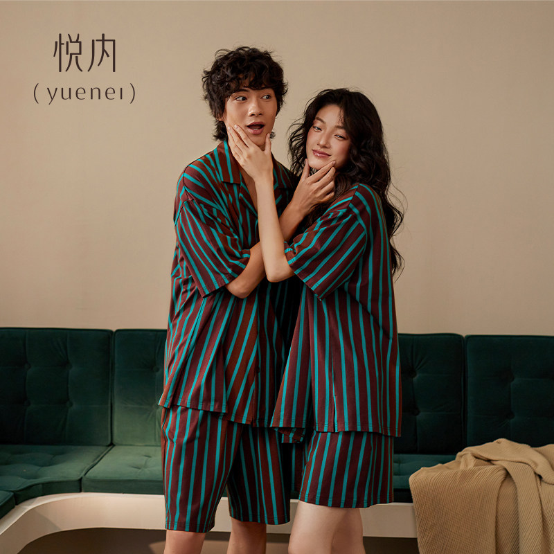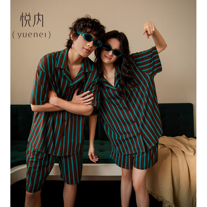 悦内情侣睡衣女夏季纯棉短袖短裤家居服夏天男款复古条纹开衫套装