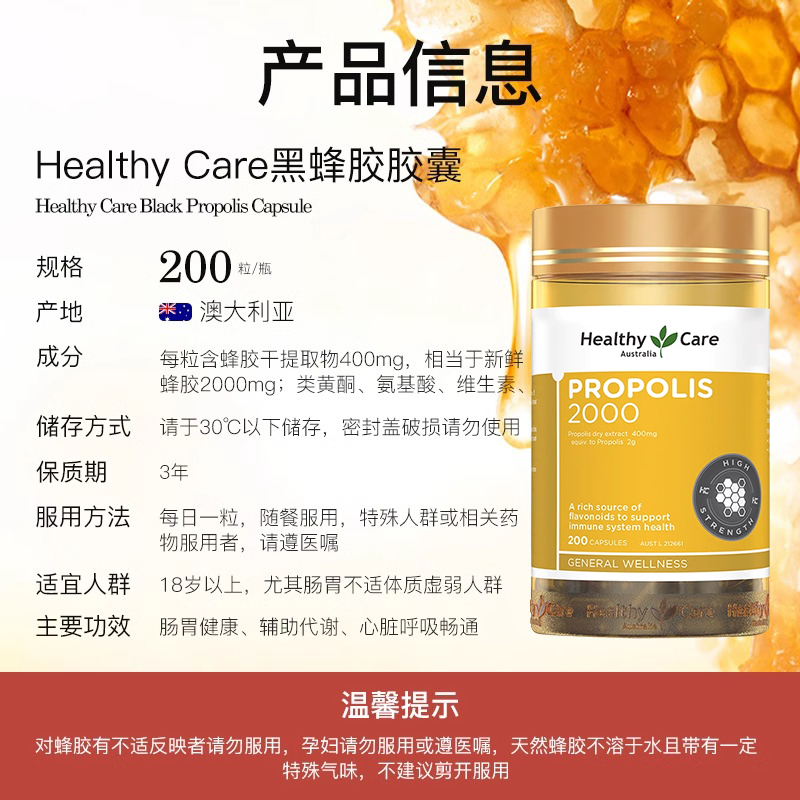 【官方旗舰】HealthyCare黑蜂胶软胶囊200粒*2瓶高浓度中老年澳洲