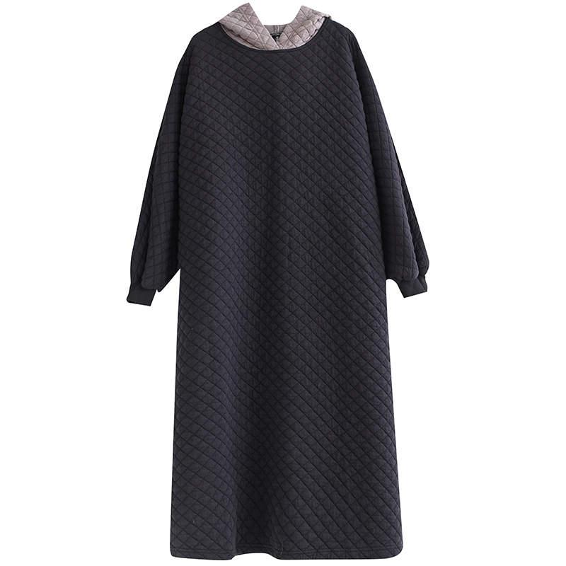 2024冬季新款大码宽松休闲纯色菱格夹棉长款气质连帽卫衣连衣裙女