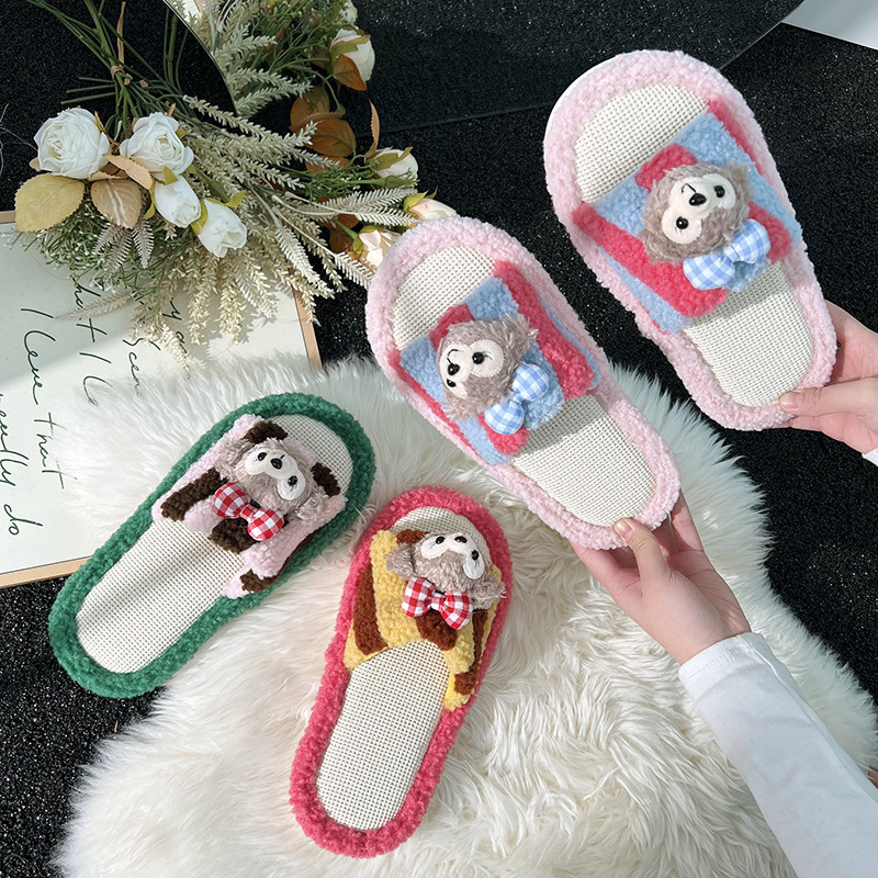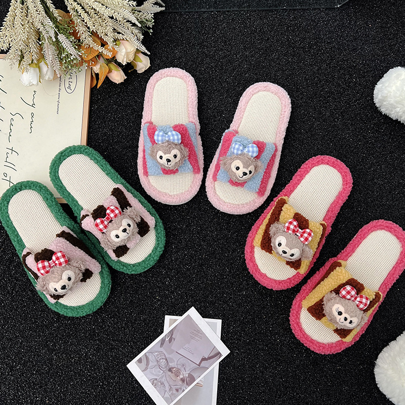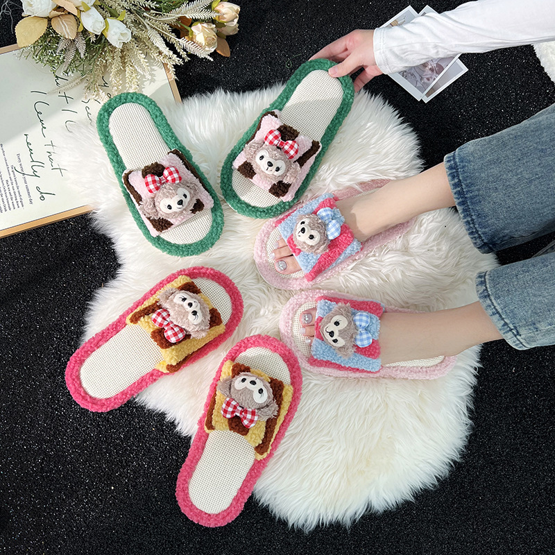 亚麻拖鞋女卡通玩偶拼色春夏季新款撞色居家静音防滑透气一字拖鞋