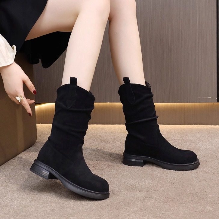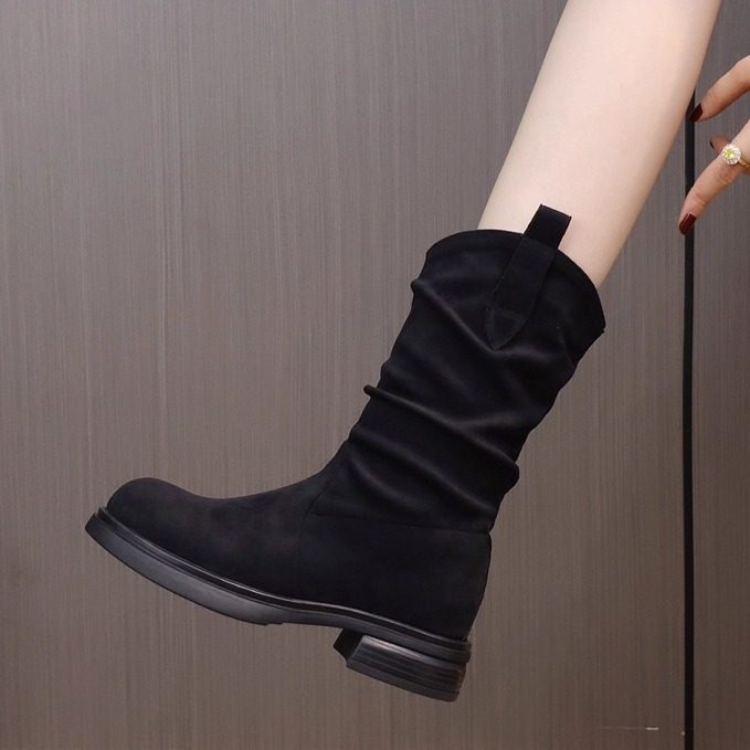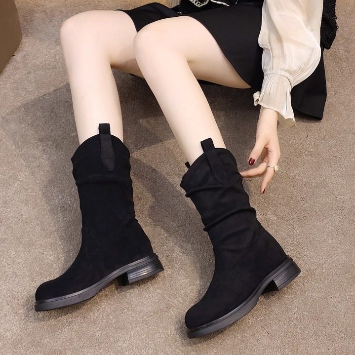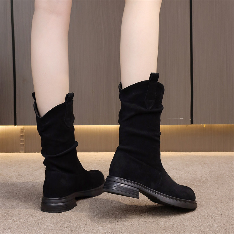 真皮厚底防滑高筒靴女冬季加绒中筒靴平底瘦瘦靴保暖弹力马丁靴女