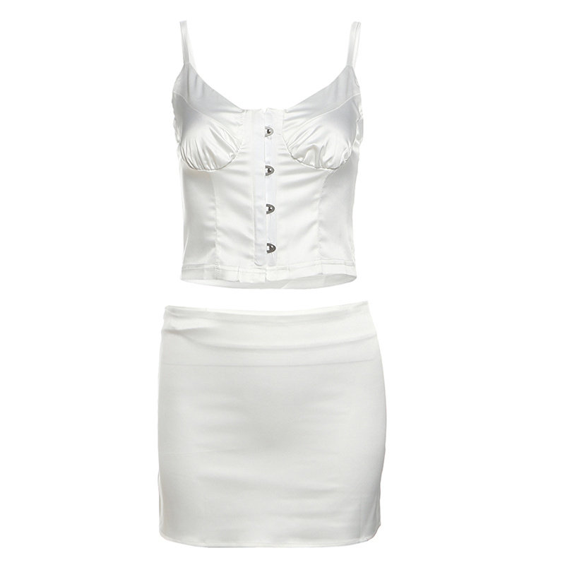 怪诞女孩 小众高级感辣妹单排扣缎面吊带背心包臀半身裙两件套女
