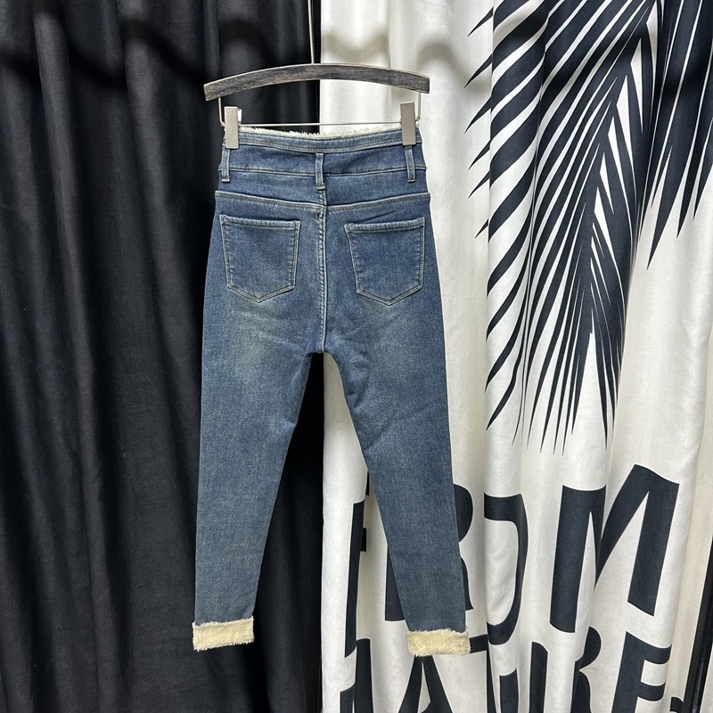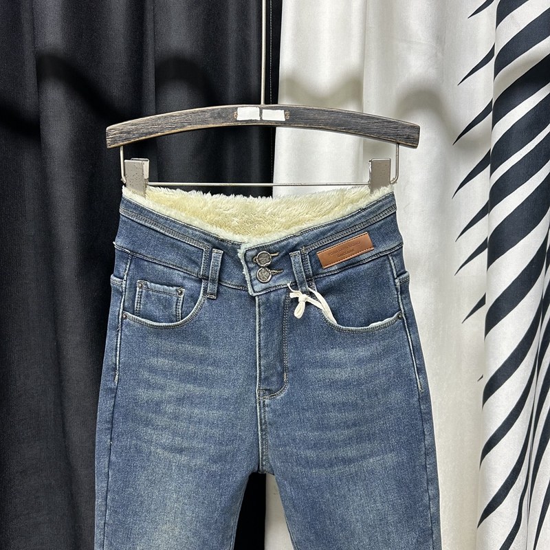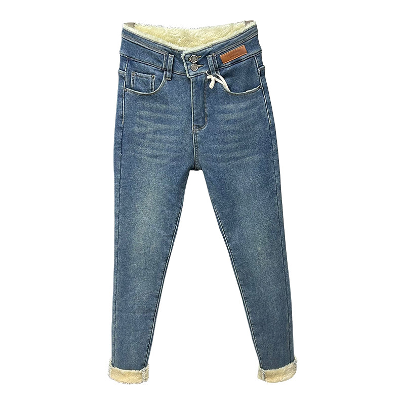 蓝色加绒高腰气质高腰铅笔牛仔裤