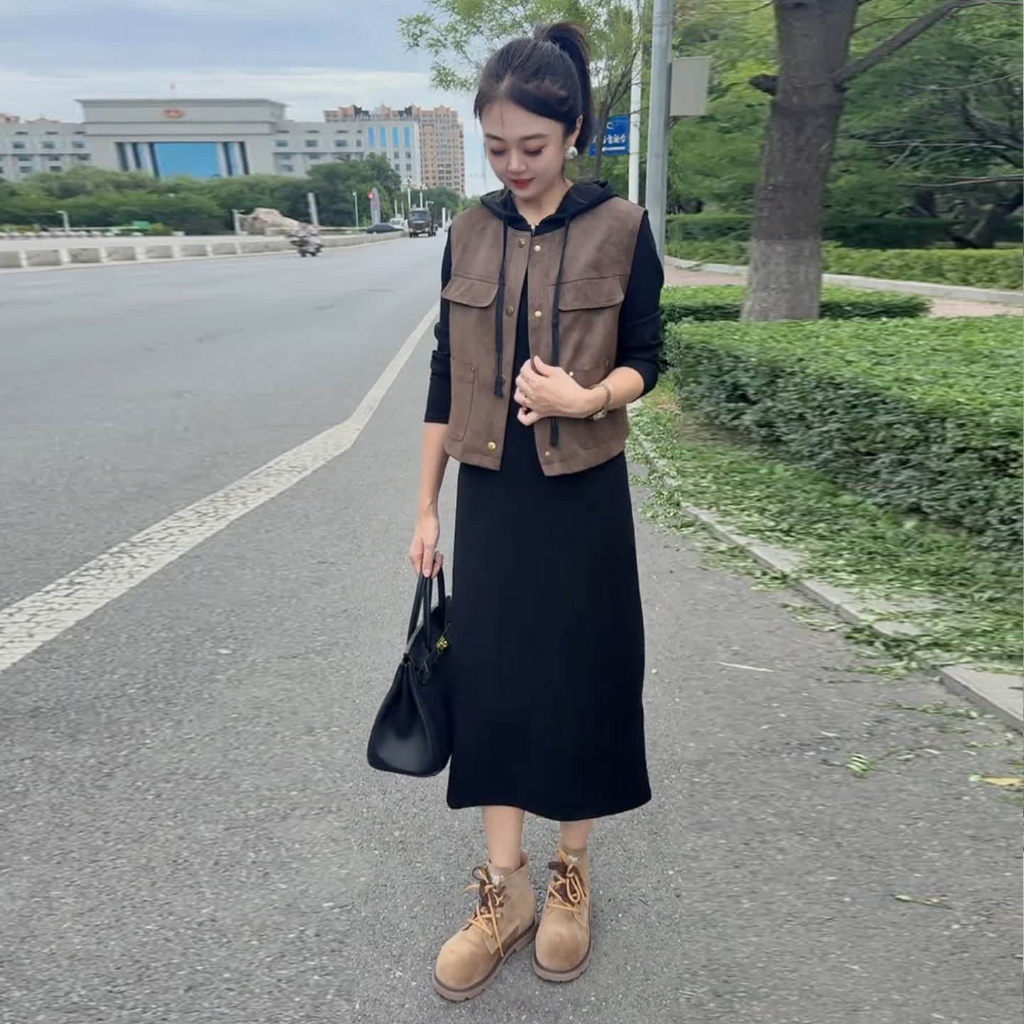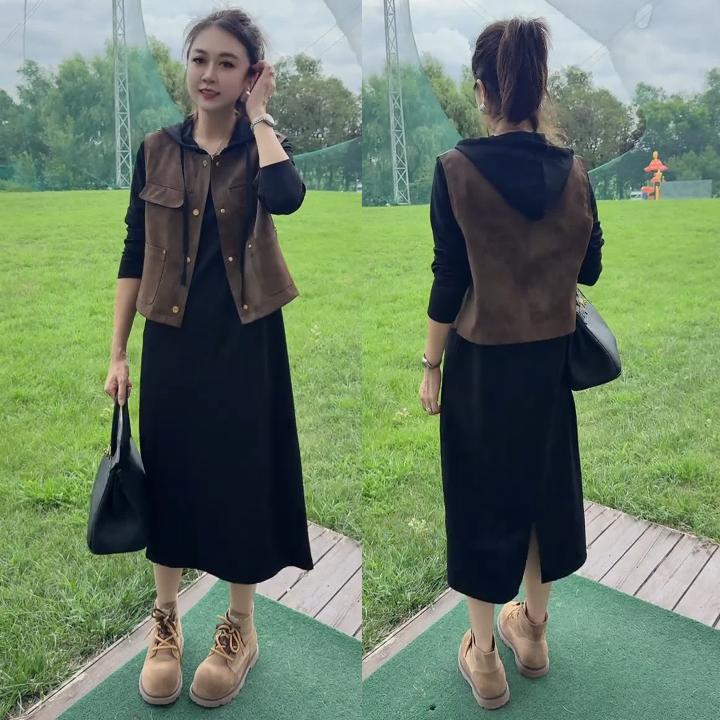 时尚休闲中长款马甲卫衣连衣裙两件套女春秋新款洋气设计感套装裙