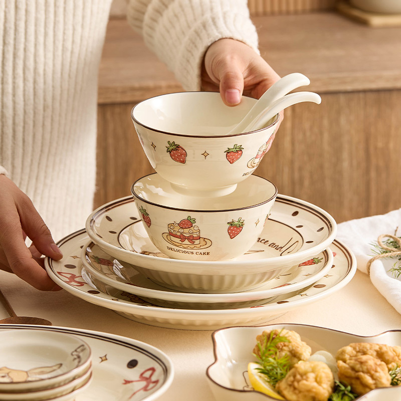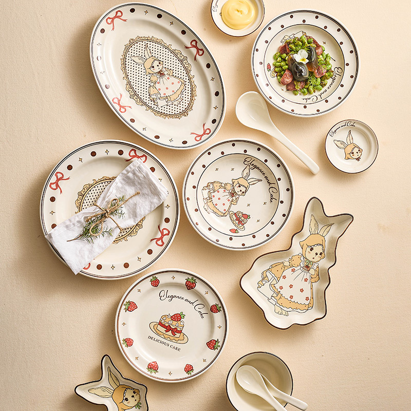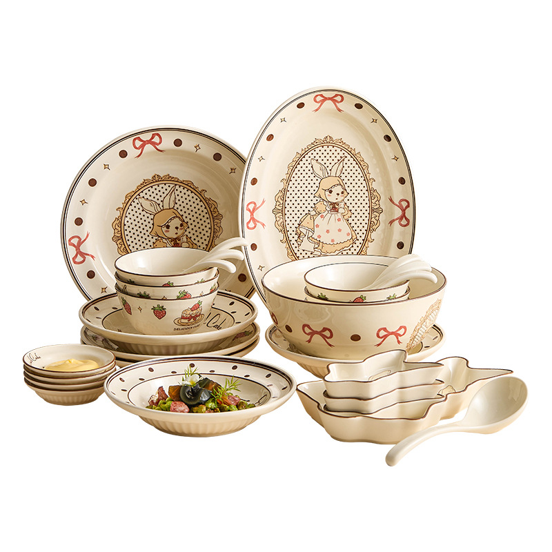 釉下彩餐具碗碟套装家用陶瓷碗筷盘创意可爱卡通兔子乔迁新居餐盘