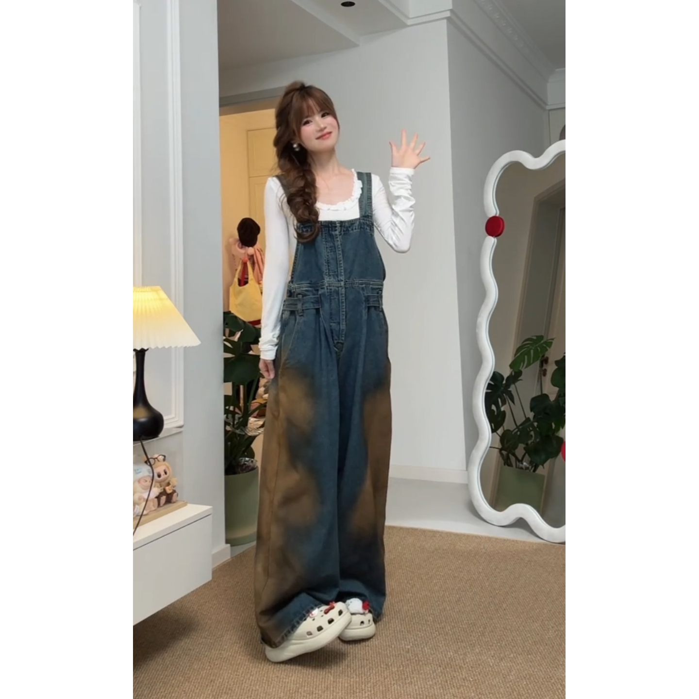 复古重工脏染工装牛仔背带裤女春秋新款宽松显瘦直筒阔腿吊带长裤
