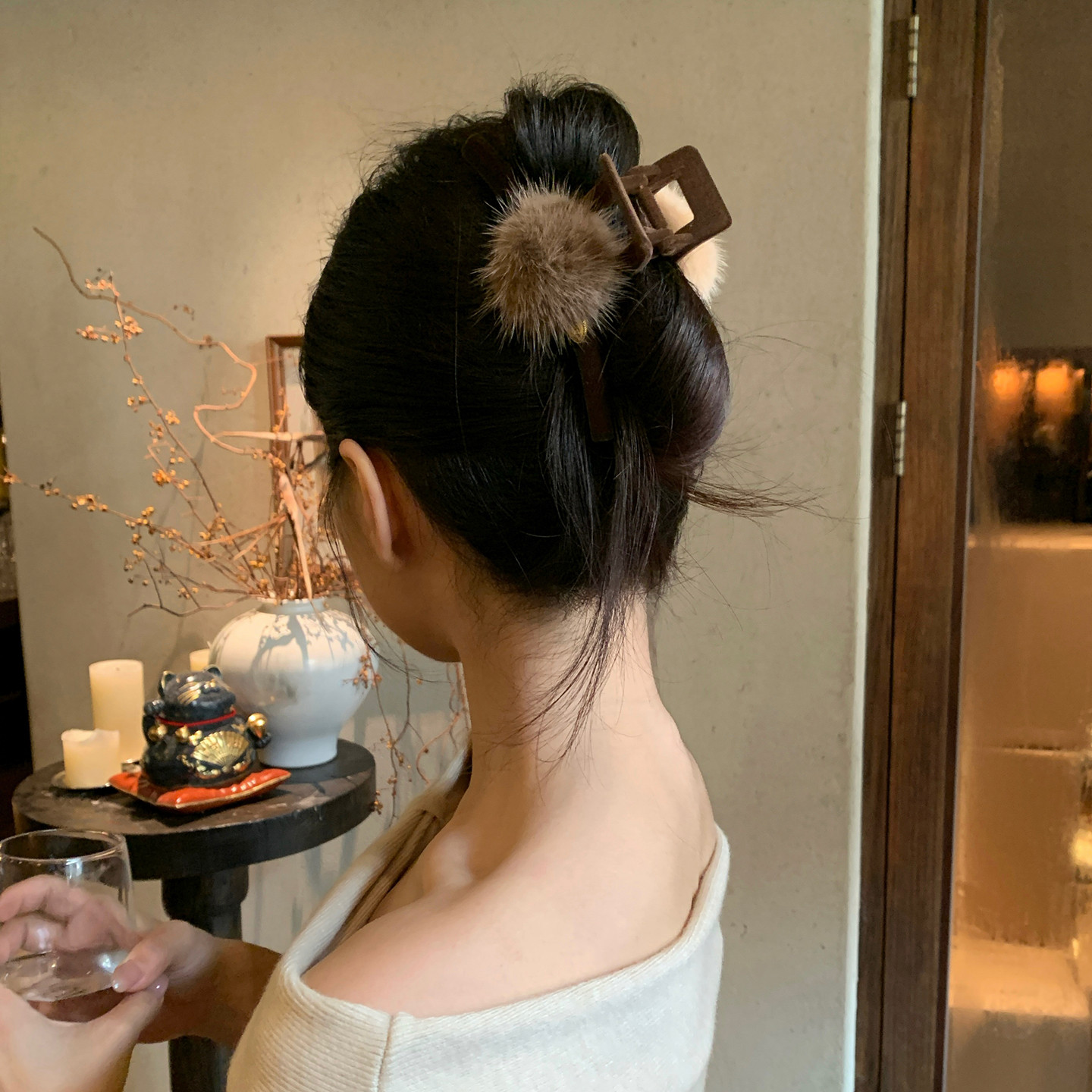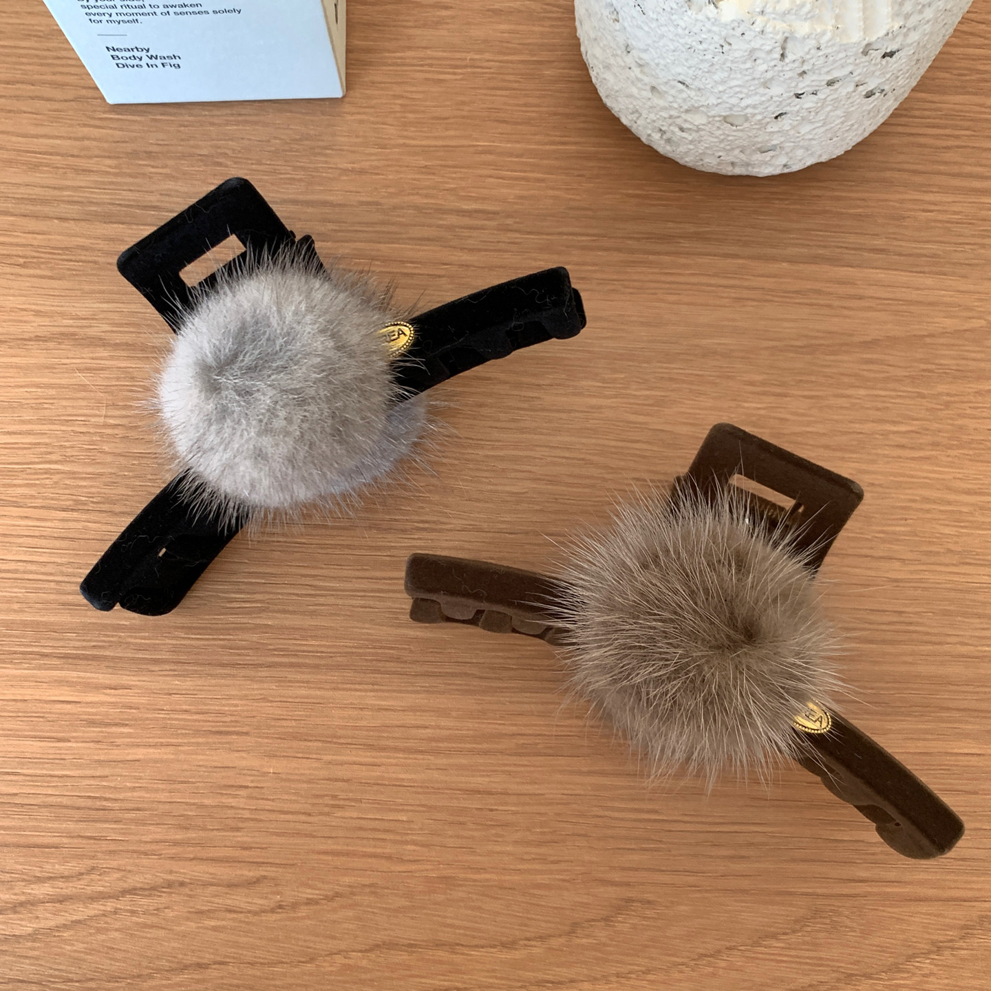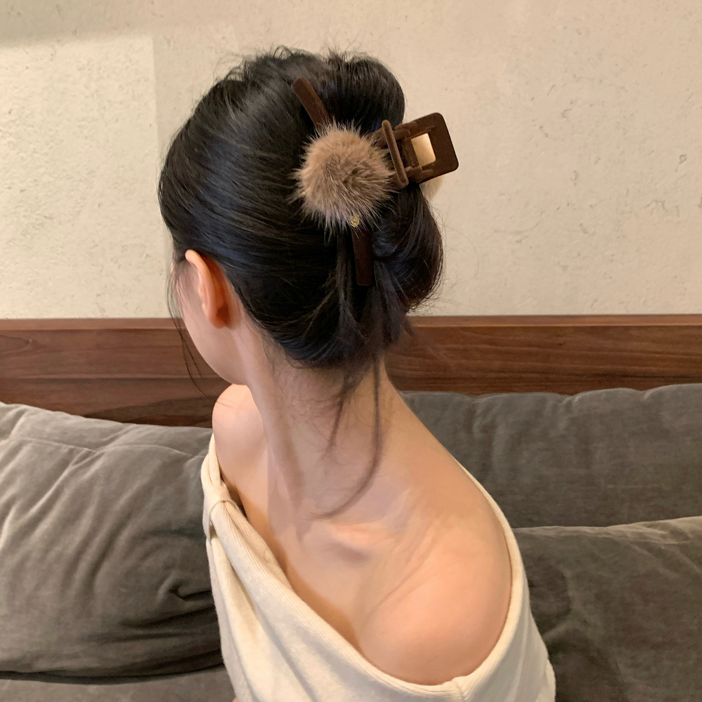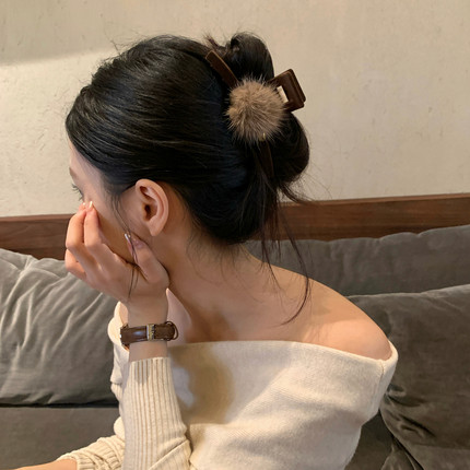 高品质水貂毛球抓夹植绒一字鲨鱼夹通勤百搭后脑勺盘发夹发饰秋冬