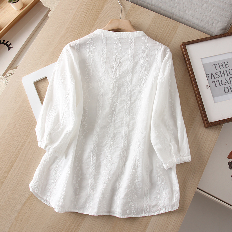通勤风韩范显瘦V领满绣衬衫女装气质白色纯棉绣花七分袖衬衣夏季